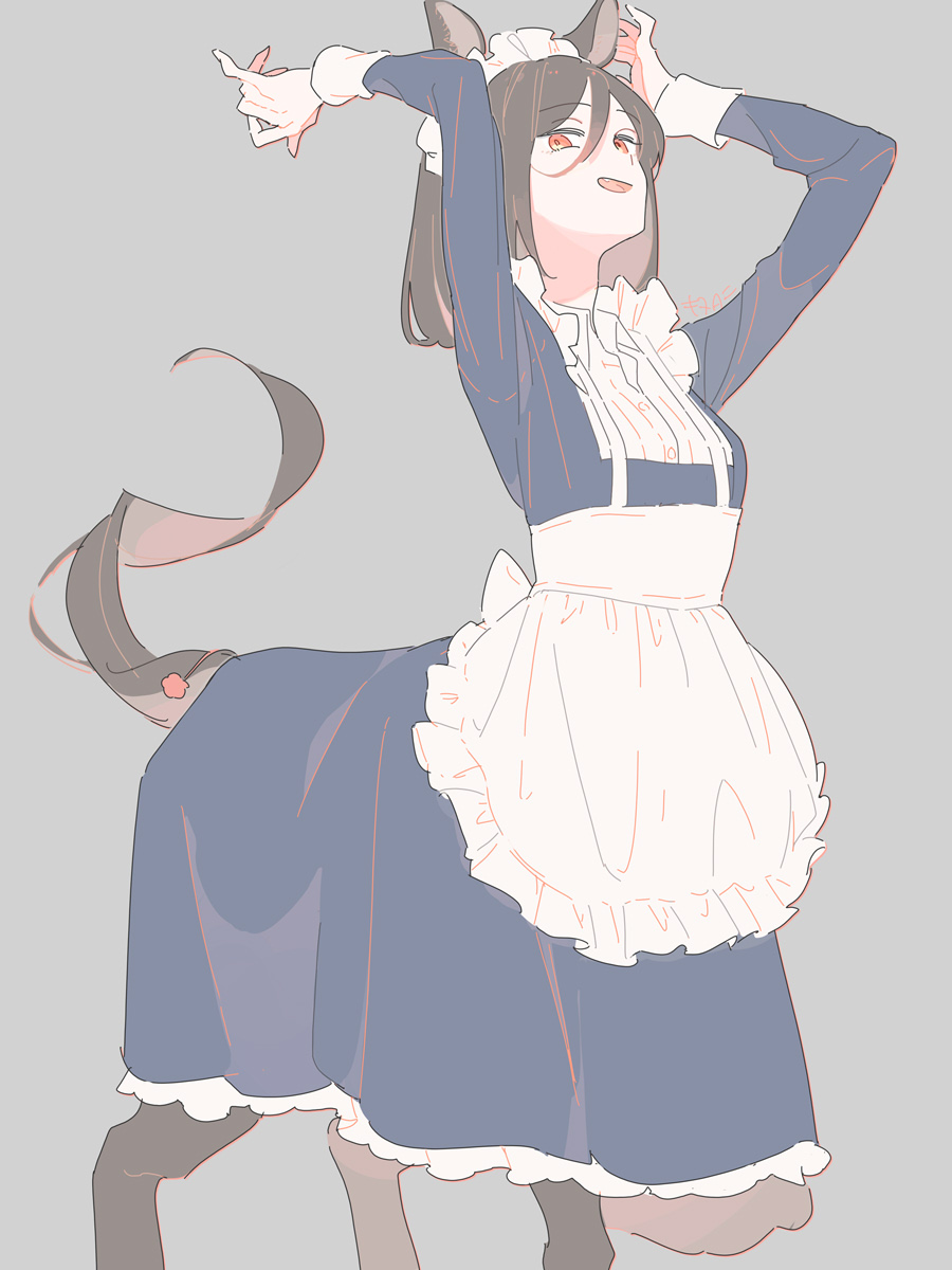 1girl animal_ears apron arms_up black_dress brown_hair centaur dress fang feet_out_of_frame grey_background highres horse_ears horse_girl kinutani_yutaka long_hair long_sleeves looking_at_viewer maid maid_apron maid_headdress monster_girl open_mouth orange_eyes original simple_background solo standing tail_raised taur