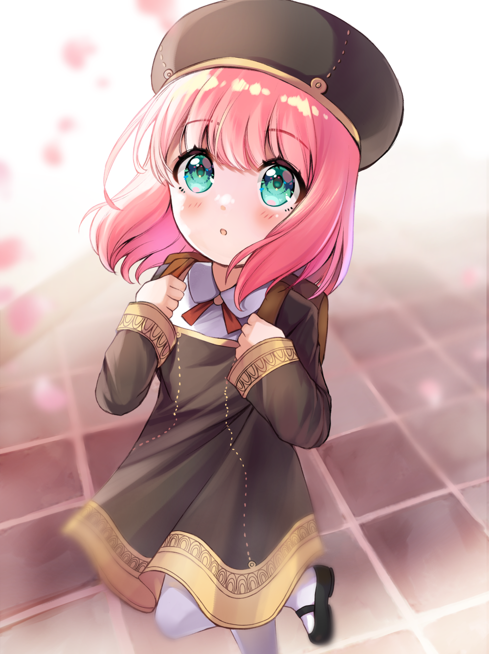 1girl anya_(spy_x_family) beret black_dress black_footwear black_hat blue_eyes blurry blurry_background blush child collared_shirt commentary depth_of_field dress eden_academy_school_uniform falling_petals full_body gold_trim hat highres looking_up mia_mikhail neck_ribbon open_mouth pantyhose petals pink_hair red_ribbon ribbon school_uniform shirt solo spy_x_family upturned_eyes white_pantyhose white_shirt
