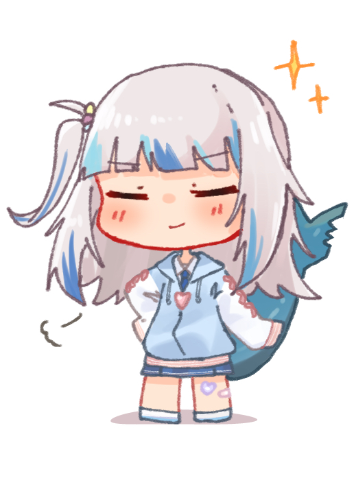 1girl bandaid bandaid_on_leg blue_eyes blue_hair blue_jacket blue_skirt blunt_bangs blush chibi chibi_only closed_eyes commentary cross-laced_clothes cross-laced_sleeves fins fish_tail gawr_gura gawr_gura_(school_uniform) glint grey_hair hololive hololive_english hood hooded_jacket jacket kurushiro1102 long_hair multicolored_hair official_alternate_costume official_alternate_hairstyle one_side_up raglan_sleeves school_uniform shark_tail skirt solo streaked_hair tail virtual_youtuber white_sleeves