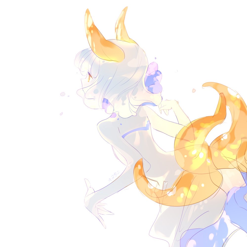 1girl antennae artist_name blue_footwear blue_hair commentary_request dress hands_up kinutani_yutaka monster_girl multicolored_hair orange_eyes original sea_slug_girl short_hair simple_background solo tail upper_body white_background white_dress white_hair