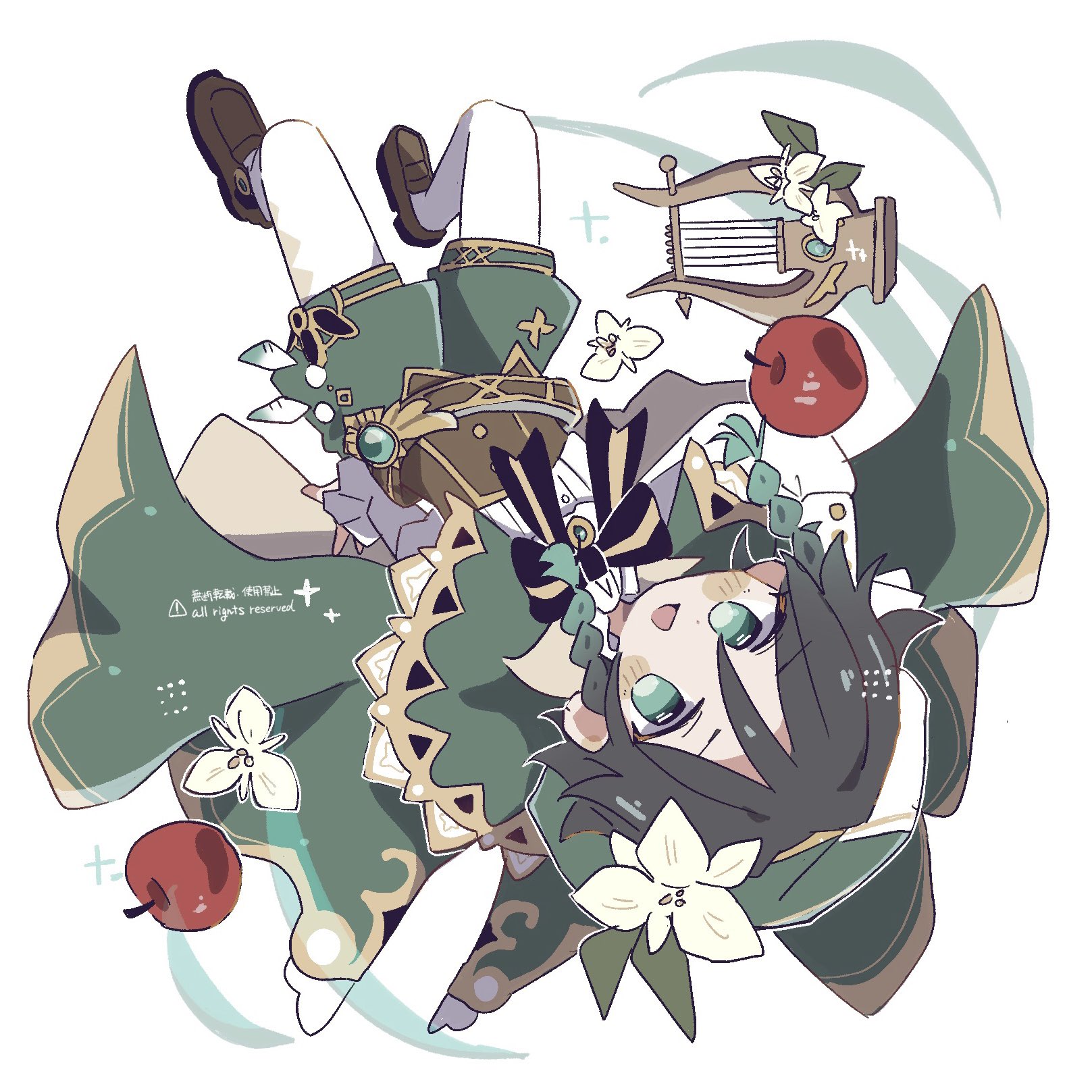 1boy air_(air_en0) apple black_hair blush bow braid cape flower food fruit genshin_impact green_cape green_eyes green_hair green_hat green_shorts hashtag-only_commentary hat highres instrument long_sleeves looking_at_viewer lyre male_focus multicolored_hair open_mouth pantyhose shoes shorts simple_background solo twin_braids upside-down venti_(genshin_impact) white_background white_flower white_pantyhose