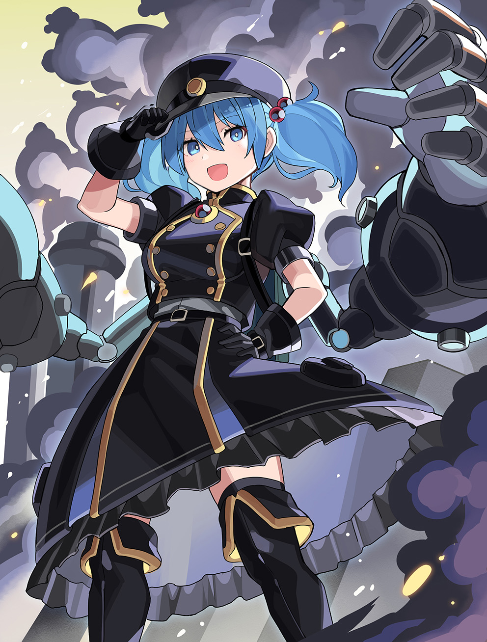 1girl :d alternate_costume black_gloves black_hat black_skirt black_thighhighs blue_eyes blue_hair boots commentary_request falken_(yutozin) gloves hair_bobbles hair_ornament hand_on_own_hip hat highres kawashiro_nitori looking_at_viewer open_mouth puffy_short_sleeves puffy_sleeves revision short_sleeves skirt smile solo standing thigh_boots thighhighs touhou twintails