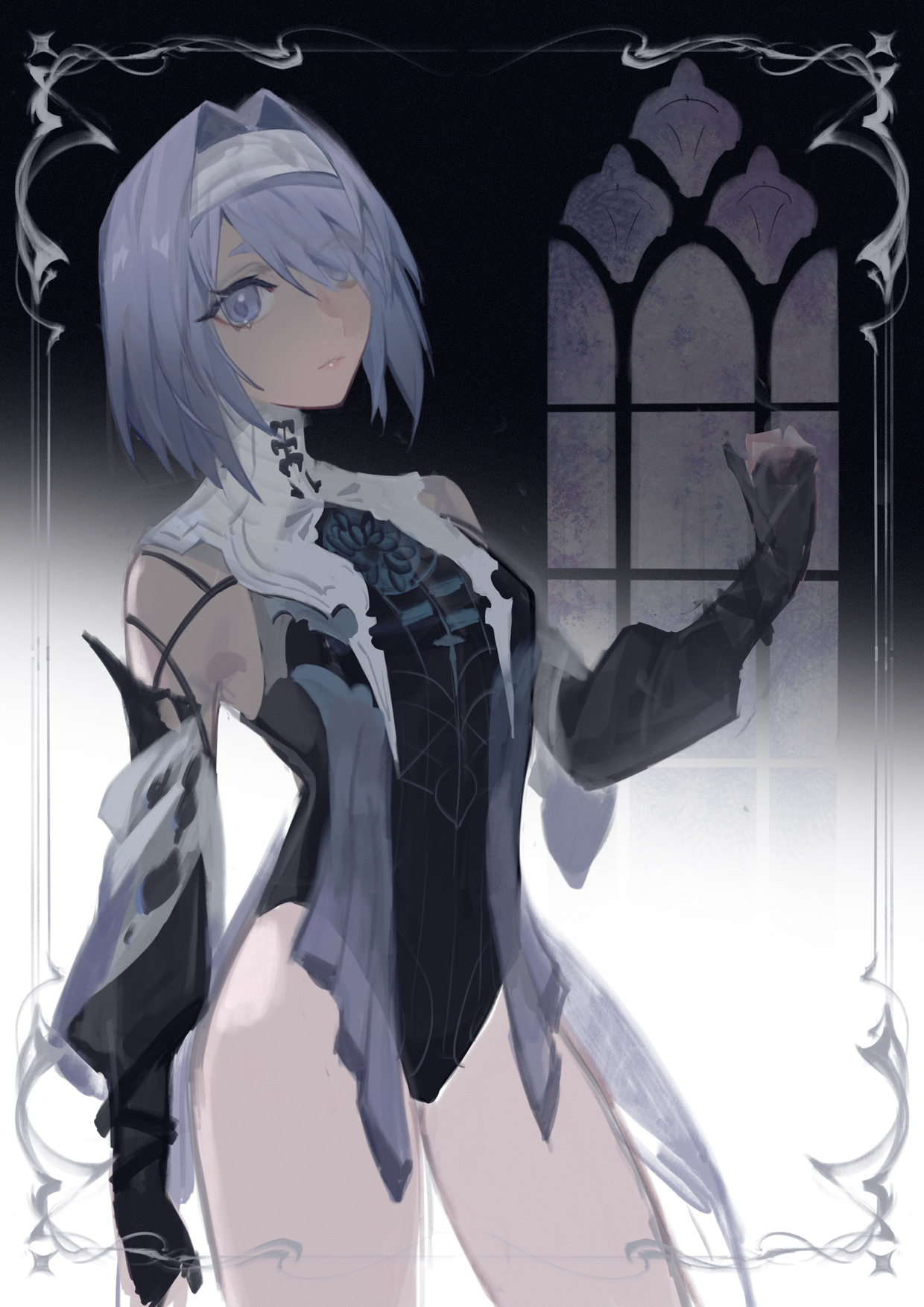 18_kawaki 1girl alisa:_echo_(pgr) alisa:_echo_(twilight_veil)_(pgr) alisa_(pgr) bare_legs black_gloves black_leotard blue_eyes blue_hair closed_mouth collar detached_sleeves gloves hair_intakes hairband high_collar highres layered_sleeves leotard medium_hair official_alternate_costume official_alternate_hairstyle punishing:_gray_raven solo white_collar white_hairband