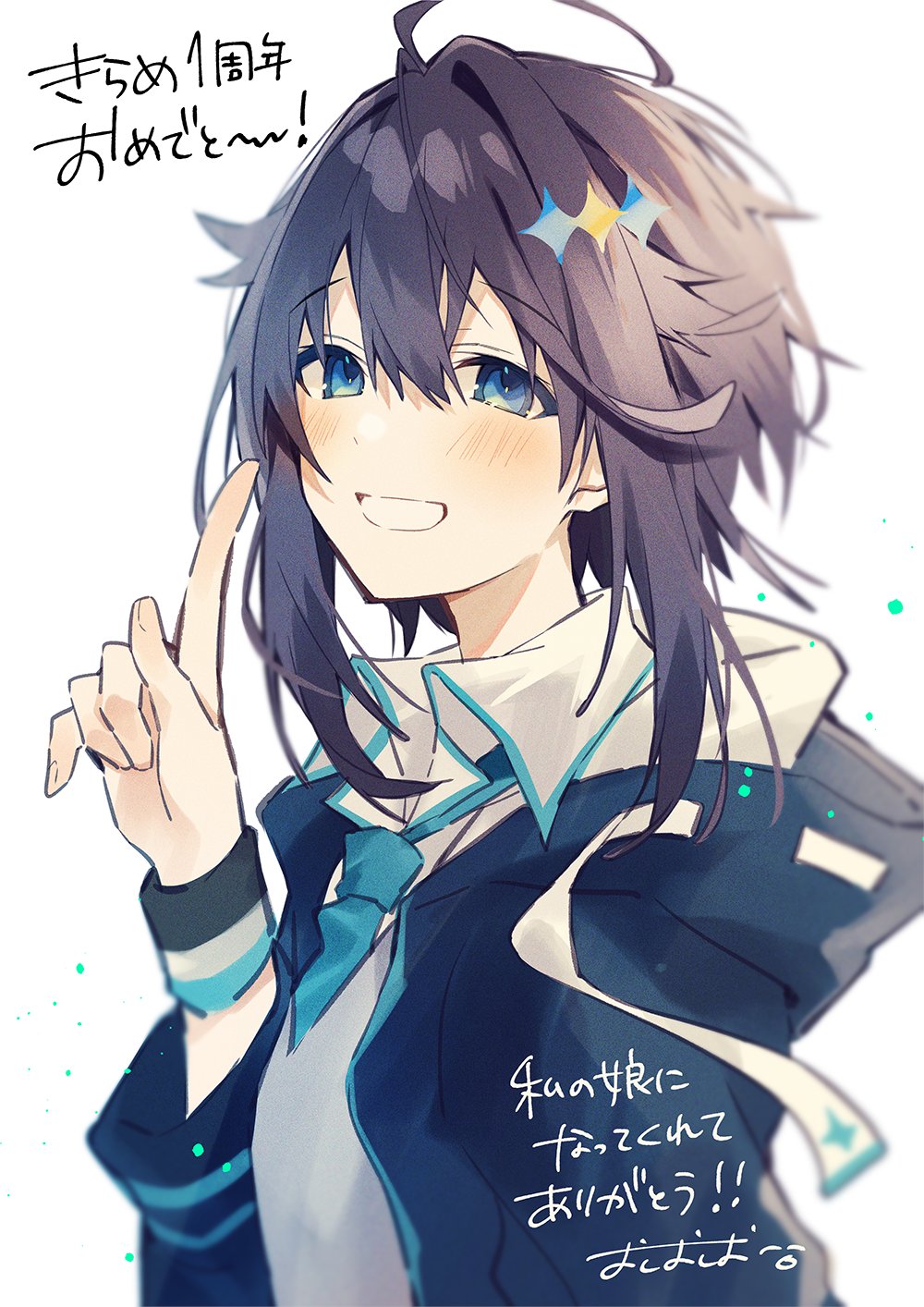 1girl ahoge anniversary black_jacket blue_eyes blue_necktie brown_hair collared_shirt hair_ornament hand_up highres hood hood_down hooded_jacket index_finger_raised jacket looking_at_viewer necktie nijisanji open_clothes open_jacket oshioshio shirt simple_background smile solo sorahoshi_kirame sorahoshi_kirame_(1st_costume) teeth upper_body virtual_youtuber white_shirt