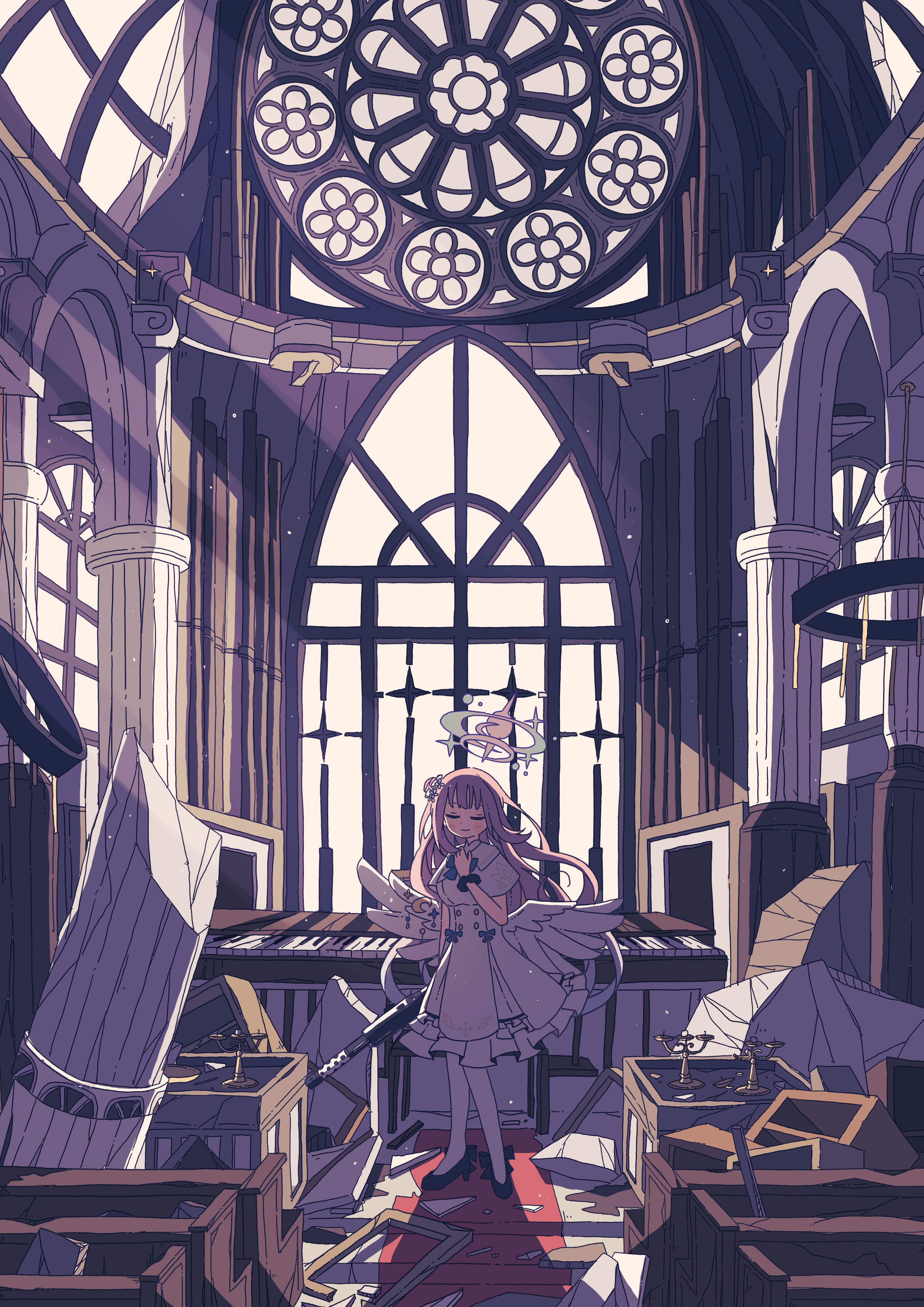 1girl absurdres akashia_(akasia313) arch arm_at_side black_footwear black_scrunchie blue_archive broken_pillar candlestand capelet church closed_eyes dress facing_viewer full_body gradient_halo gun hair_bun halo hand_on_own_chest high_heels highres holding holding_gun holding_weapon instrument lanchester_smg light_smile long_hair low_wings mika_(blue_archive) multicolored_halo pantyhose pew piano pillar pink_hair pumps ruins scrunchie shadow sidelighting single_side_bun sleeveless sleeveless_dress solo standing stool submachine_gun sunlight weapon white_capelet white_dress white_pantyhose white_wings window wing_ornament wings wrist_scrunchie