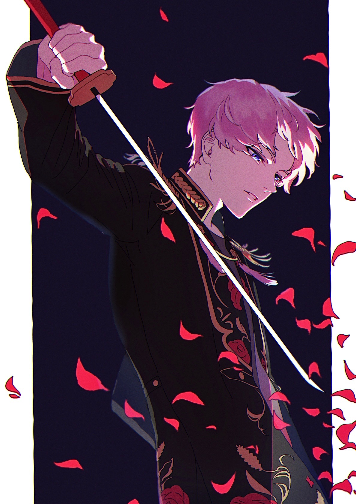 1boy black_jacket blue_eyes border ensemble_stars! half-closed_eyes highres hnd15098770 holding holding_sword holding_weapon itsuki_shu jacket katana long_sleeves male_focus open_mouth petals pillarboxed pink_hair short_hair solo sword weapon white_border