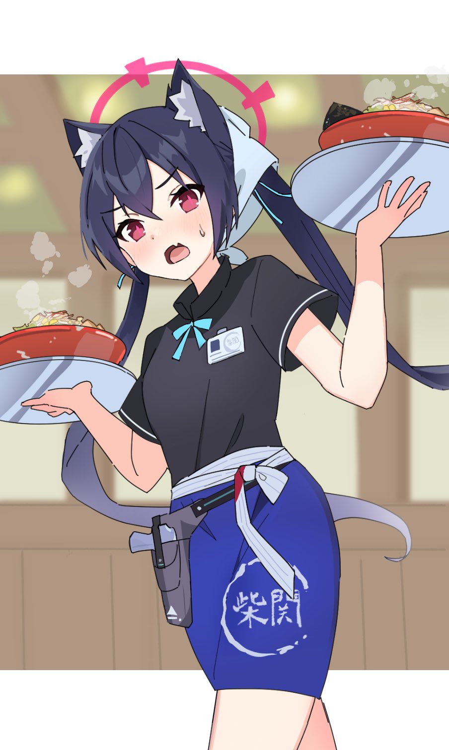 1girl animal_ear_fluff animal_ears black_shirt blue_archive blue_hair blue_skirt blurry blurry_background bowl breasts cat_ears cat_girl cowboy_shot dark_blue_hair fang food gun halo hidaka_ui highres holding holding_tray holster holstered id_card indoors letterboxed long_hair looking_at_viewer miniskirt neck_ribbon open_mouth outside_border red_eyes ribbon serika_(blue_archive) serika_(waitress)_(blue_archive) shirt short_sleeves skin_fang skirt small_breasts solo standing steam sweat thigh_holster tray twintails waitress weapon