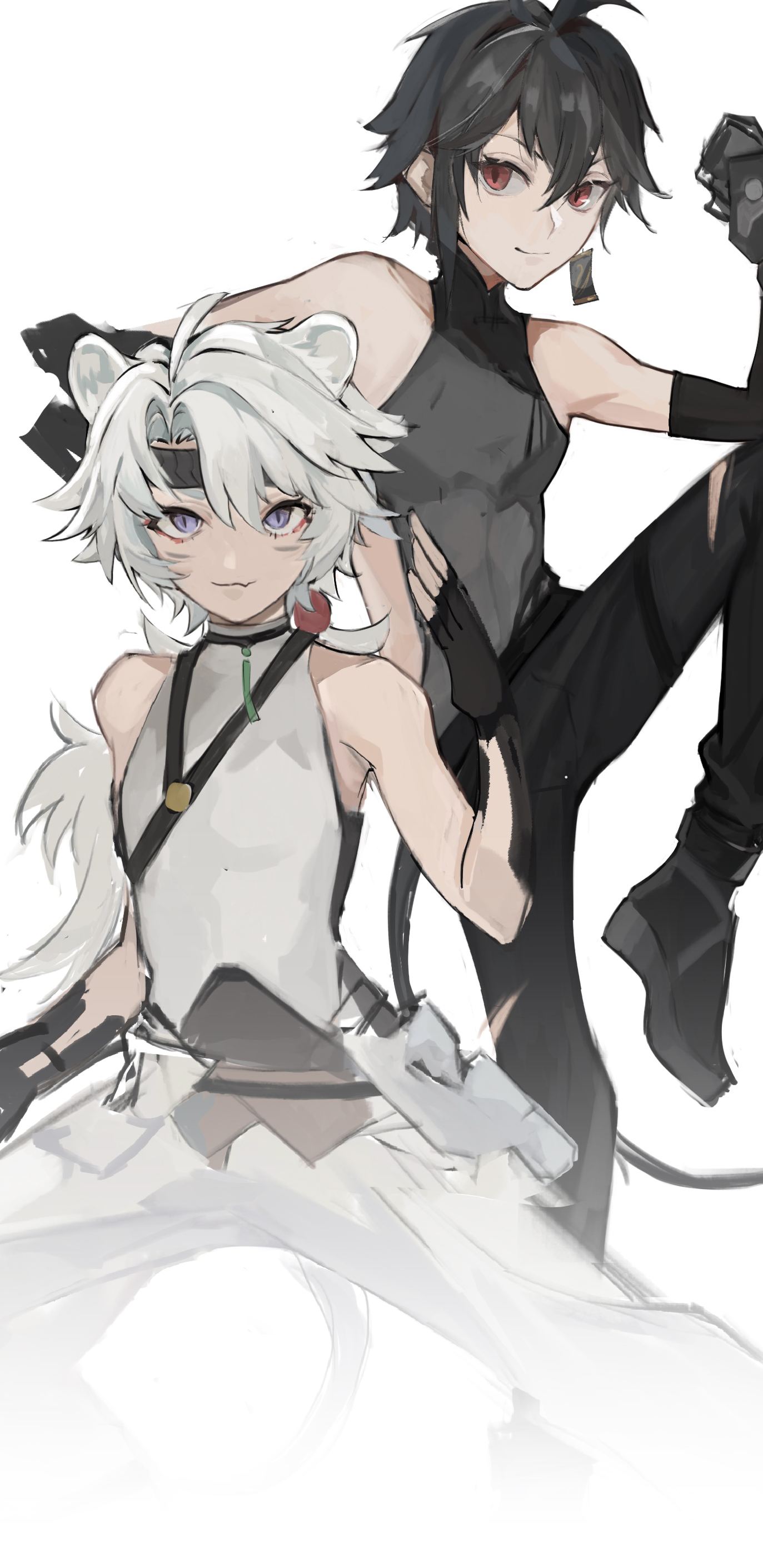 18_kawaki 2boys absurdres ahoge animal_ears asymmetrical_bangs black_gloves black_hair black_pants black_shirt blue_eyes bright_pupils changyu_(pgr) changyu_(punishing:_gray_raven) character_request copyright_request crossed_bangs earrings fang fingerless_gloves gloves hair_between_eyes highres jewelry mechanical_arms medium_hair multiple_boys ofuda_earrings pants punishing:_gray_raven red_eyes shirt sidelocks single_earring skin_fang sleeveless sleeveless_shirt slit_pupils voice_actor_connection white_background white_hair white_pupils white_shirt