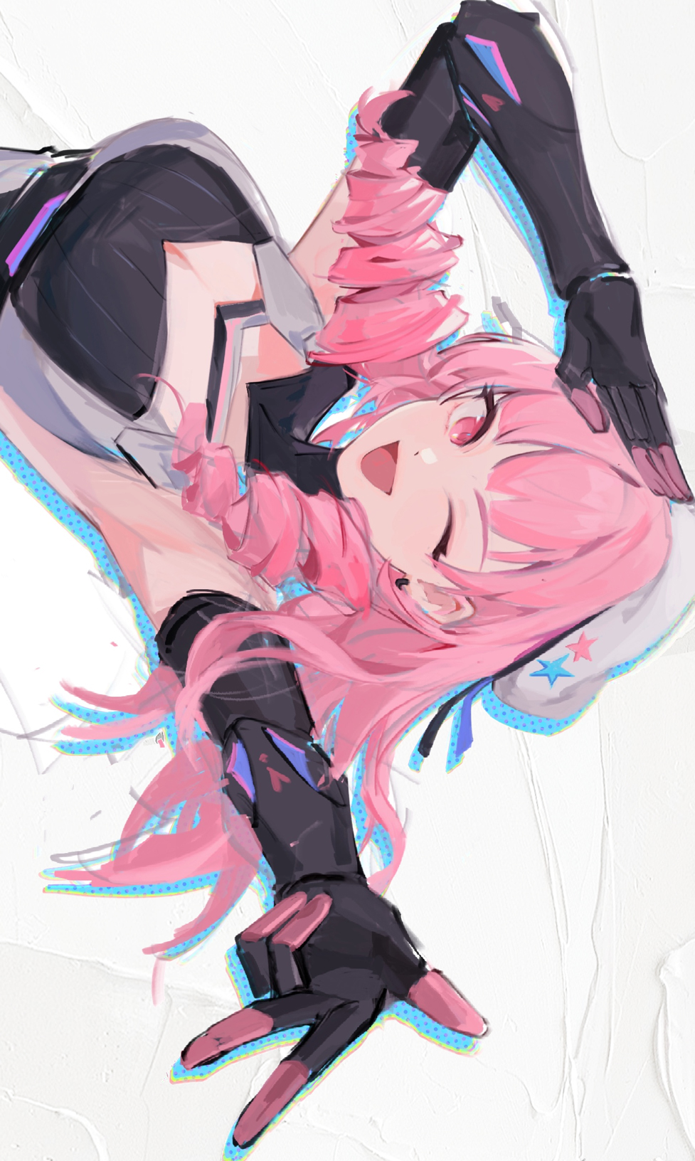 18_kawaki 1girl ayla:_kaleido_(pgr) black_collar black_shirt breasts cleavage collar detached_collar drill_hair grey_shirt highres joints large_breasts long_hair mechanical_arms one_eye_closed open_mouth pink_eyes pink_hair punishing:_gray_raven robot_joints shirt side_drill sleeveless sleeveless_shirt solo