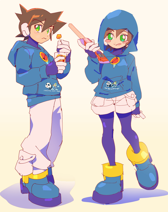 1boy 1girl aile_(mega_man_zx) black_bodysuit blue_hoodie blush_stickers bodysuit bodysuit_under_clothes brown_hair food full_body green_eyes holding holding_food hood hood_down hood_up hoodie kon_(kin219) mega_man_(series) mega_man_zx pants short_hair shorts simple_background tongue tongue_out vent_(mega_man) white_background white_pants white_shorts