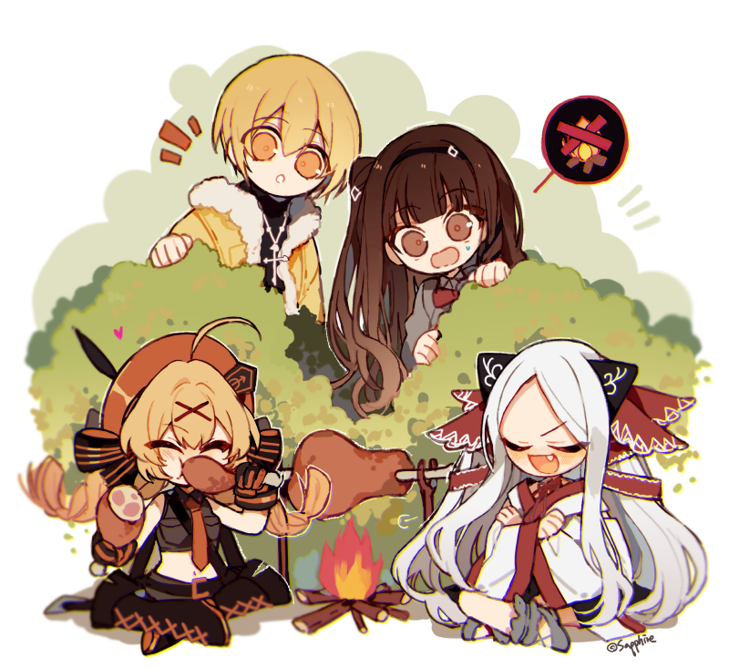 1boy 3girls ahoge black_footwear black_sweater blonde_hair boned_meat bonfire boots bow braid brown_eyes brown_hair bush closed_eyes commander_(forever_7th_capital) eating female_commander_(forever_7th_capital) food forever_7th_capital hat jacket jewelry long_hair long_sleeves meat multiple_girls necklace one_side_up open_mouth orange_bow orange_hat sapphire_(nine) sidelocks sitting smile striped_bow sweater tesla_(forever_7th_capital) twin_braids very_long_hair white_hair yellow_eyes yellow_jacket yui_(forever_7th_capital) yuutou_(forever_7th_capital)