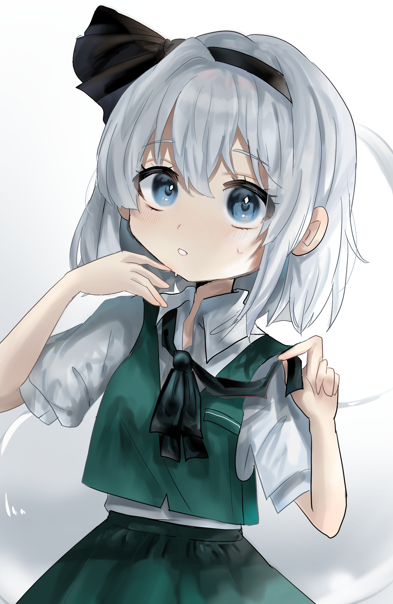1girl blue_eyes bow bowtie green_skirt green_vest grey_hair hairband highres konpaku_youmu open_mouth ramochi short_hair skirt skirt_set solo sword teeth touhou upper_body vest wakizashi weapon white_hair