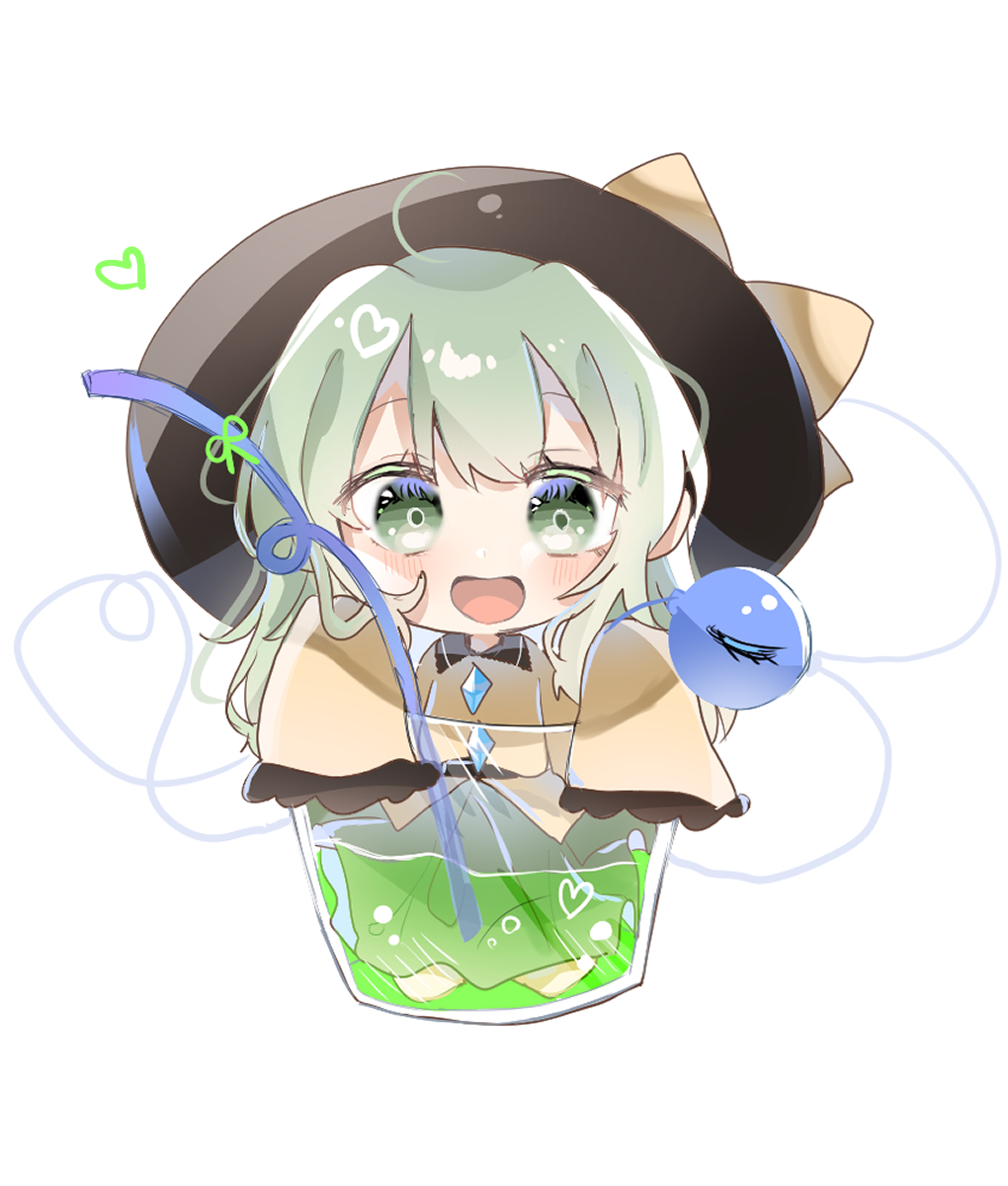 1girl black_hat blouse borrowed_character bow buttons chibi cup diamond_button doodles eyeball frilled_sleeves frills green_eyes green_hair green_skirt hat hat_bow hat_ribbon heart heart_of_string highres komeiji_koishi open_mouth ramochi ribbon shirt skirt solo third_eye touhou white_background wide_sleeves yellow_bow yellow_ribbon yellow_shirt