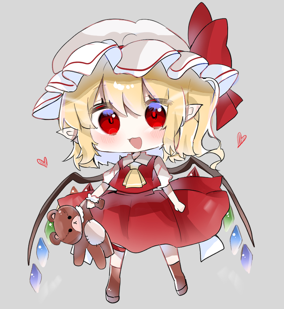 1girl ascot blonde_hair chibi crystal flandre_scarlet hat hat_ribbon holding mob_cap multicolored_wings one_side_up open_mouth puffy_short_sleeves puffy_sleeves ramochi red_eyes red_skirt red_vest ribbon short_sleeves side_ponytail skirt skirt_set solo stuffed_animal stuffed_toy teddy_bear touhou vest white_hat wings yellow_ascot