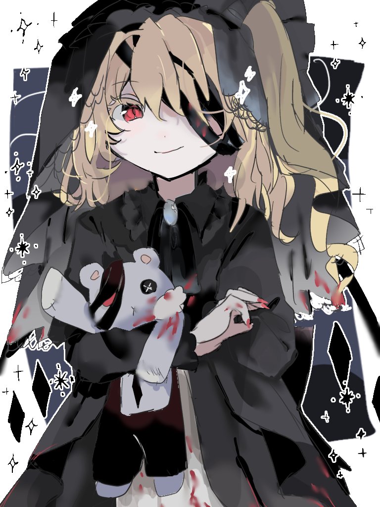 1girl bat_wings black_shirt blonde_hair blood brooch flandre_scarlet hair_over_one_eye holding jewelry one_side_up ramochi red_eyes shirt short_hair side_ponytail stuffed_animal stuffed_toy teddy_bear touhou upper_body wings