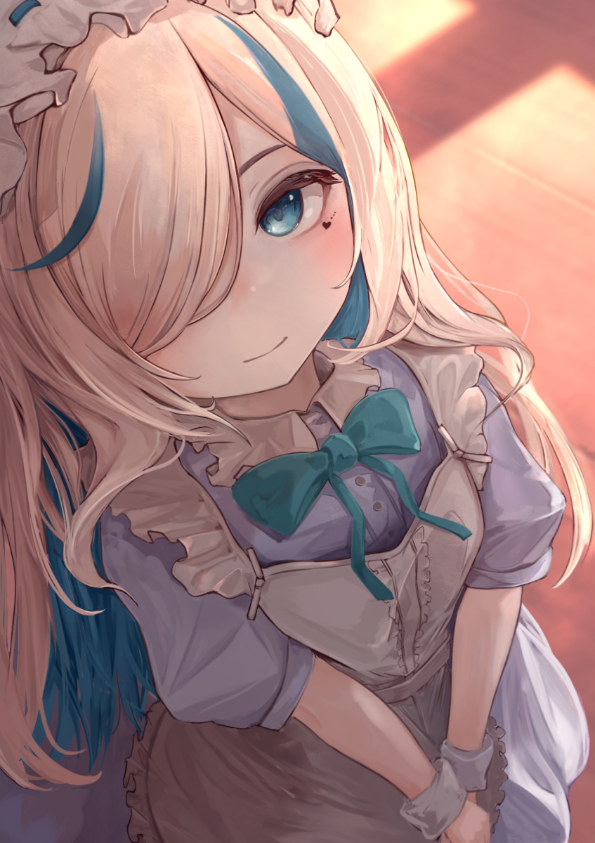 1girl apron asaikeu blonde_hair blue_bow blue_bowtie blue_dress blue_eyes blue_hair blush bow bowtie closed_mouth commentary dress facial_tattoo frilled_hairband frills from_above hair_over_one_eye hairband heart heart_tattoo highres ilu_fluor indie_virtual_youtuber light_smile long_hair looking_at_viewer looking_up mole mole_under_eye multicolored_hair one_eye_covered puffy_short_sleeves puffy_sleeves short_sleeves solo streaked_hair tattoo virtual_youtuber white_apron white_hairband wrist_cuffs
