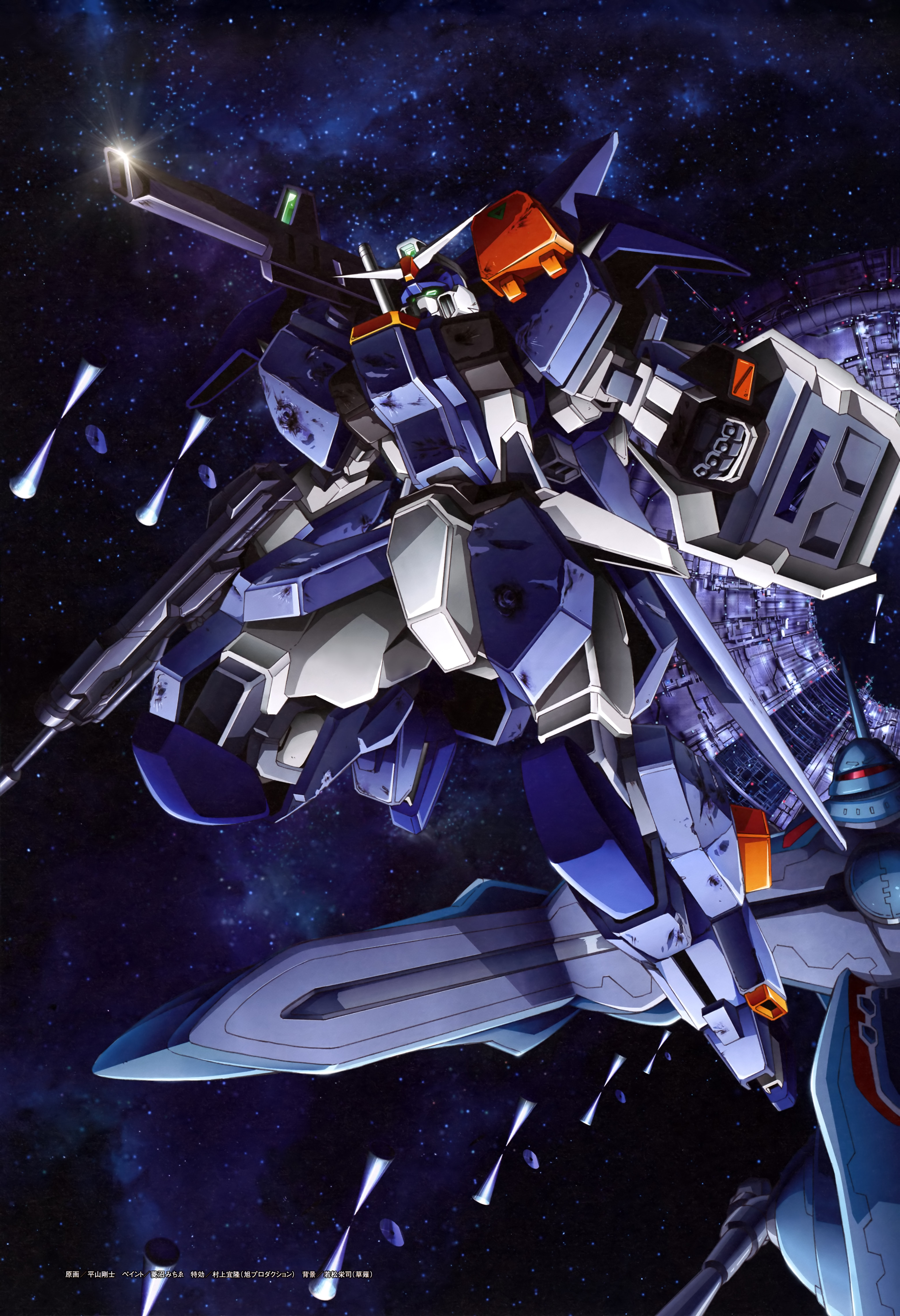 absurdres armor beam_rifle duel_gundam energy_gun energy_sword gun gundam gundam_perfect_file gundam_seed highres hirayama_takeshi holding holding_gun holding_shield holding_weapon mecha mobile_suit no_humans official_art railgun rifle robot shield space space_habitat spacecraft sword v-fin weapon