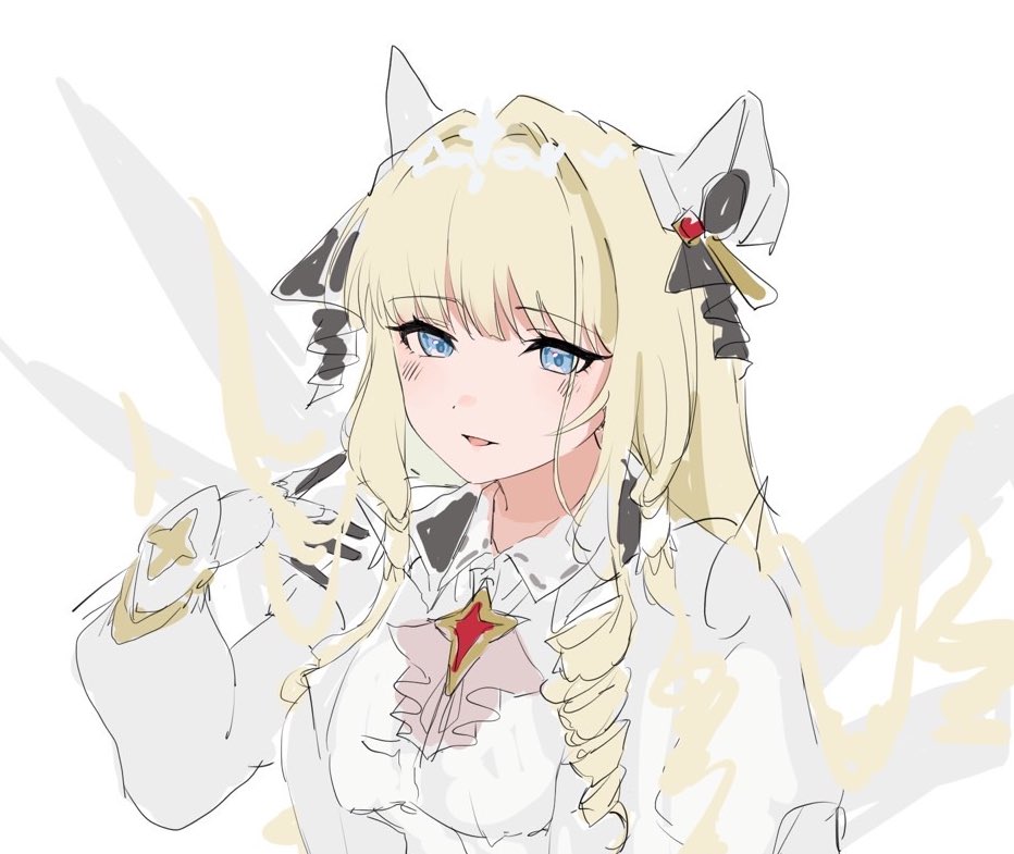 1girl armored_gloves black_ribbon blonde_hair blue_eyes breasts coat collared_shirt crown_(nikke) diadem drill_hair goddess_of_victory:_nikke hair_ornament hair_ribbon headgear jewelry light_blush long_hair medium_breasts necklace ribbon shirt sketch solo sui_nikke white_coat white_shirt