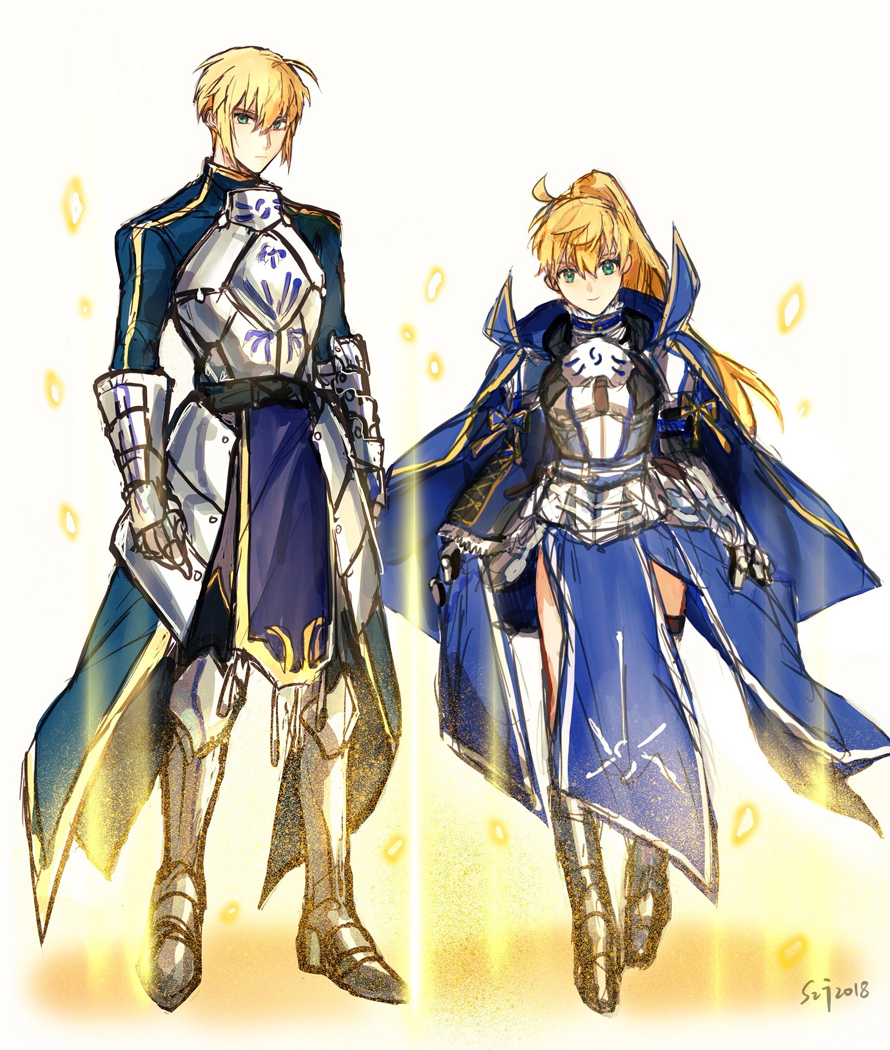 1boy 1girl ahoge armor arthur_pendragon_(fate) artist_name artoria_pendragon_(fate) blonde_hair blue_cape blue_dress breastplate cape commentary_request dress fate/grand_order fate_(series) full_body gauntlets genderswap genderswap_(ftm) genderswap_(mtf) green_eyes highres light_particles looking_at_viewer ponytail recursive_genderswap sabaton saber_(fate) sangzhujun simple_background waist_cape white_background
