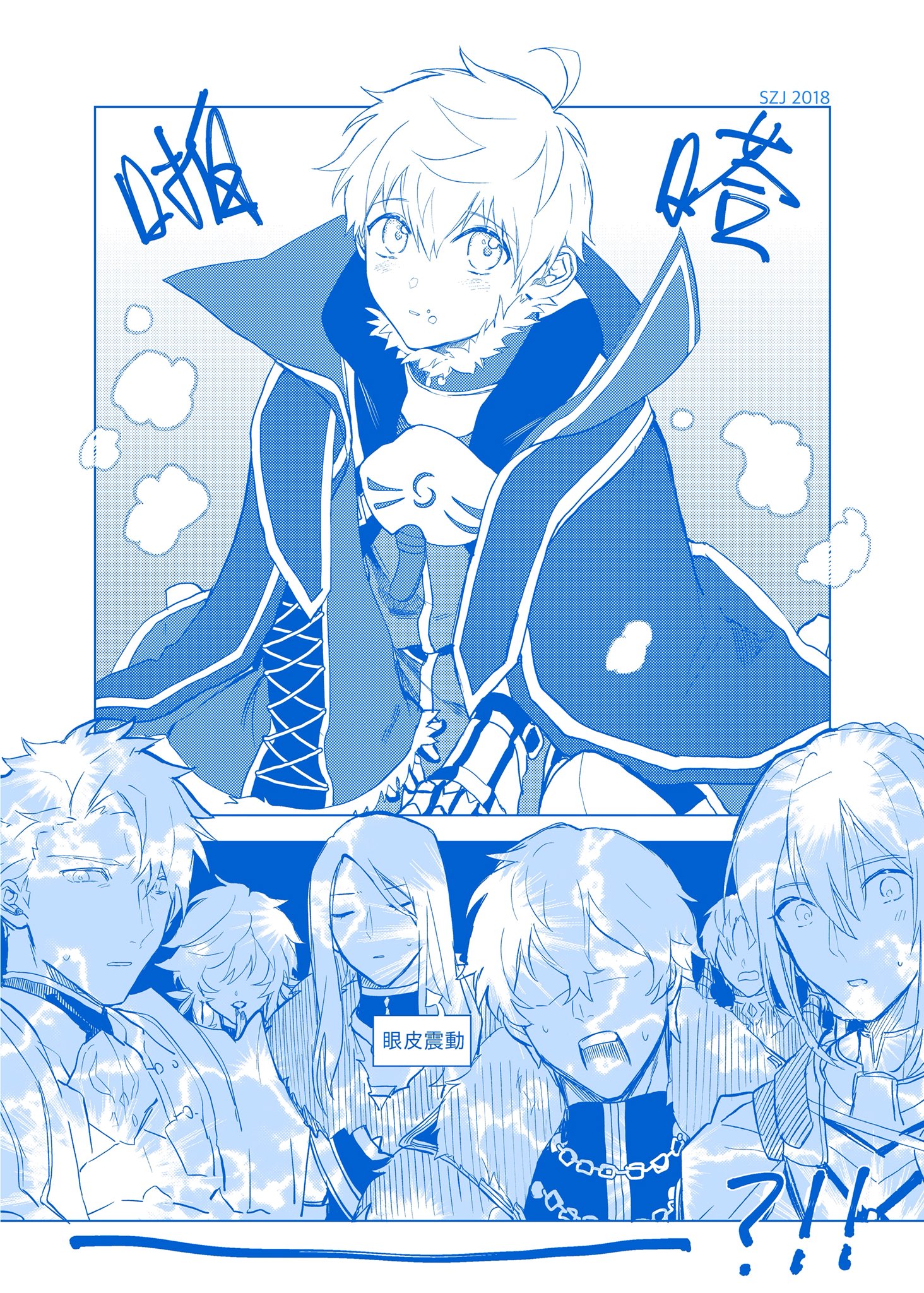 6+boys age_regression aged_down armor arrow_(symbol) arthur_pendragon_(fate) bedivere_(fate) bedivere_(third_ascension)_(fate) blonde_hair blue_theme cape chinese_commentary chinese_text fate/grand_order fate_(series) gawain_(fate) gawain_(third_ascension)_(fate) highres lancelot_(fate/grand_order) long_hair merlin_(fate) monochrome mordred_(fate/prototype) multiple_boys one_eye_closed open_mouth oversized_clothes sangzhujun short_hair surprised tristan_(fate) tristan_(third_ascension)_(fate)