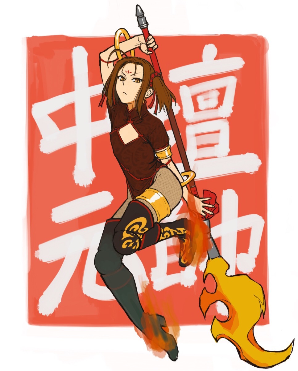 1girl armlet b_suke bangle black_boots boots bracelet brown_dress brown_hair china_dress chinese_clothes closed_mouth dress fate/grand_order fate_(series) fishnet_pantyhose fishnets hair_ornament hair_scrunchie highres holding holding_polearm holding_weapon jewelry looking_at_viewer nezha_(fate) one_side_up pantyhose polearm print_boots red_scrunchie scrunchie short_hair short_sleeves simple_background solo text_background thigh_boots thighlet translation_request weapon