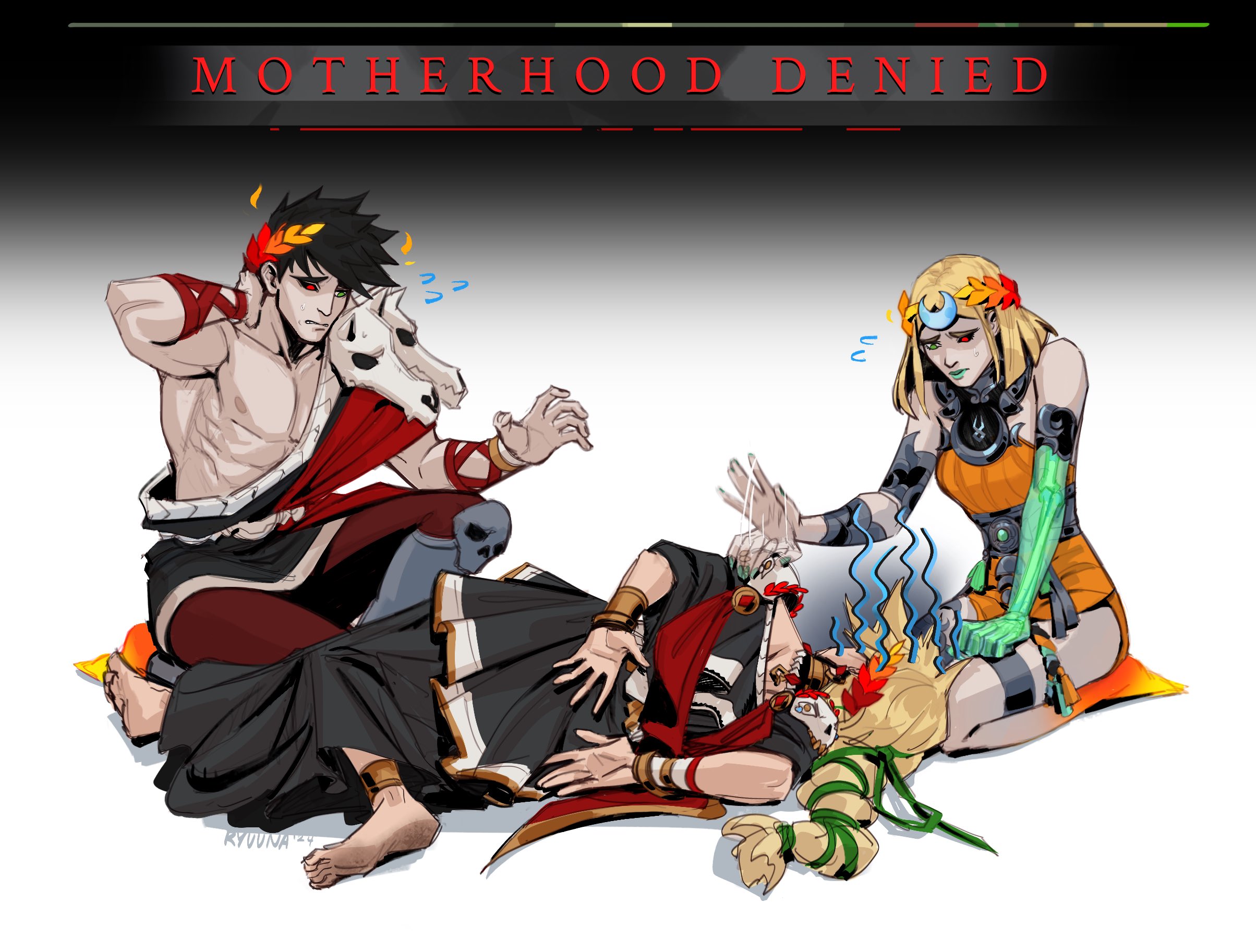 1boy 2girls ancient_greek_clothes barefoot black_dress black_hair black_sclera blonde_hair brother_and_sister colored_sclera dress english_text family family_guy family_guy_death_pose_(meme) flying_sweatdrops grace_kim_(ryuuna) greco-roman_clothes green_eyes green_lips hades_(series) hades_1 hades_2 heterochromia highres laurel_crown lying melinoe_(hades) meme mismatched_sclera mother_and_child mother_and_daughter mother_and_son multiple_girls on_side orange_dress parent_and_child persephone_(hades) red_eyes siblings single_bare_shoulder skull zagreus_(hades)