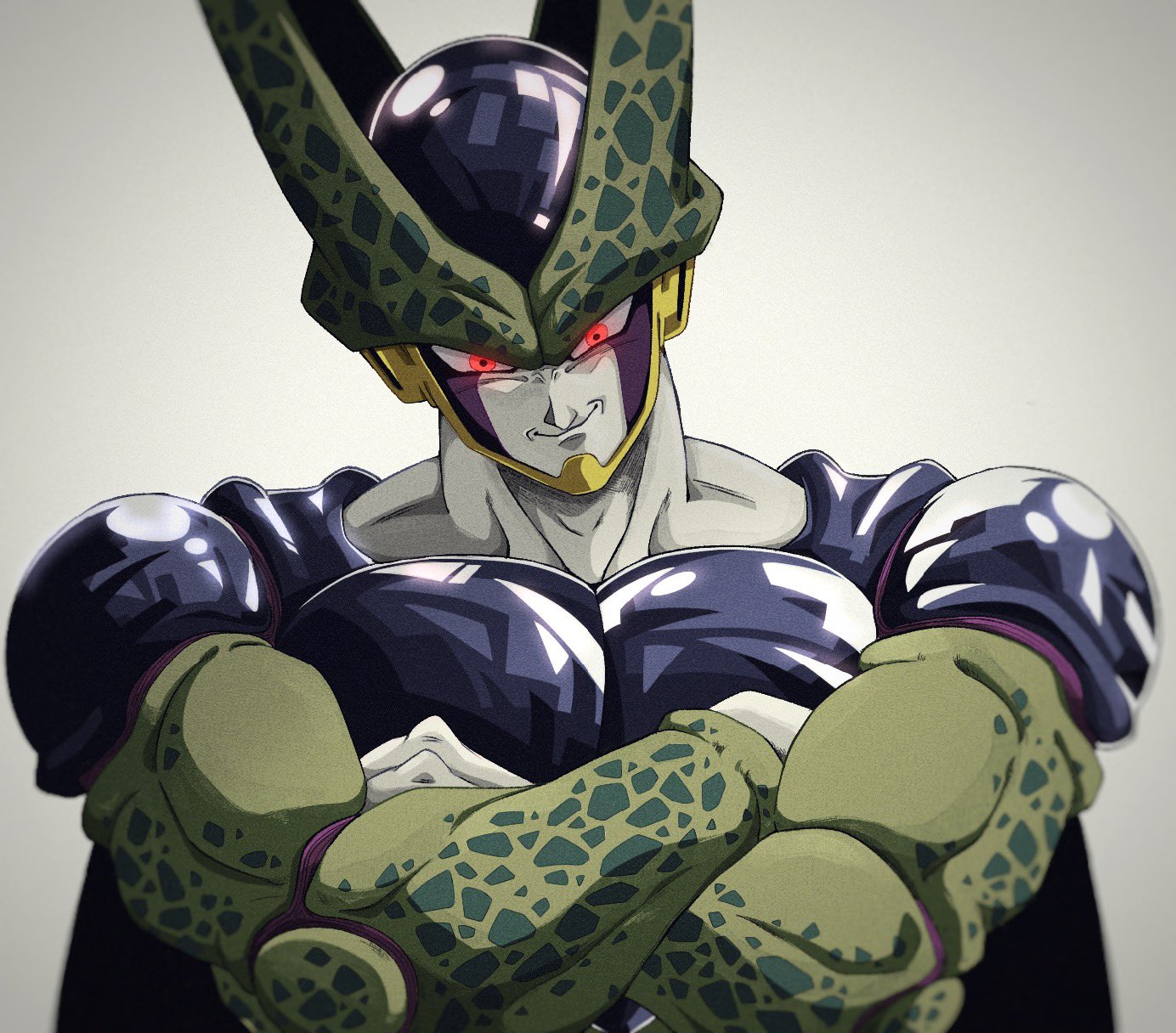 1boy black_skin blurry blurry_background bure_(fantasticyouth7) cell_(dragon_ball) colored_skin crossed_arms dragon_ball dragonball_z green_skin highres muscular muscular_male red_eyes simple_background smile upper_body