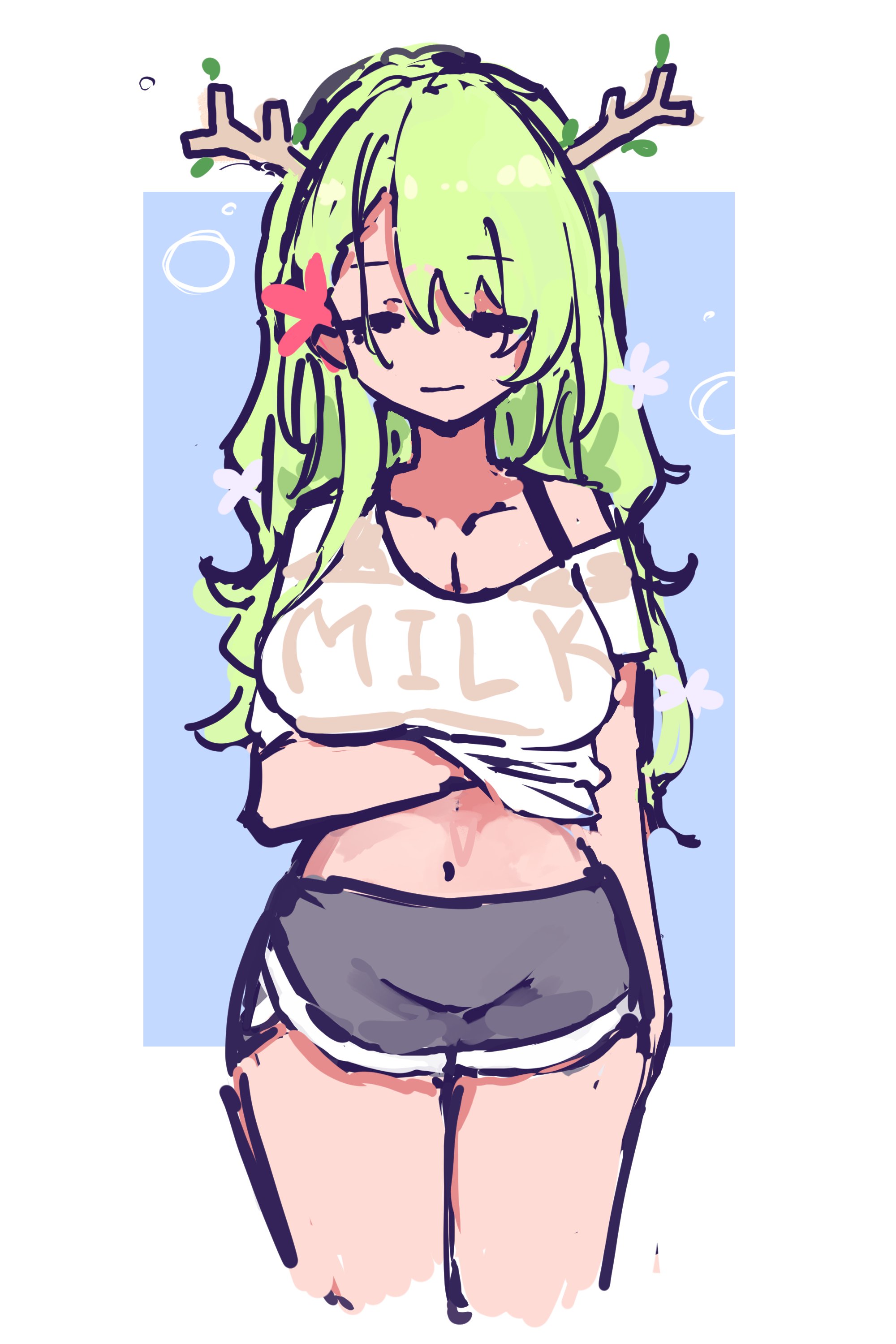 1girl absurdres alternate_costume antlers blue_background border bra_strap breasts ceres_fauna cleavage closed_eyes commentary cowboy_shot cropped_legs dolphin_shorts english_commentary english_text flower green_hair hair_flower hair_ornament hand_under_clothes hand_under_shirt highres hololive hololive_english horns large_breasts long_hair midriff_peek mole mole_under_eye navel shirt shorts sleepy solo ty4nak virtual_youtuber white_border white_shirt