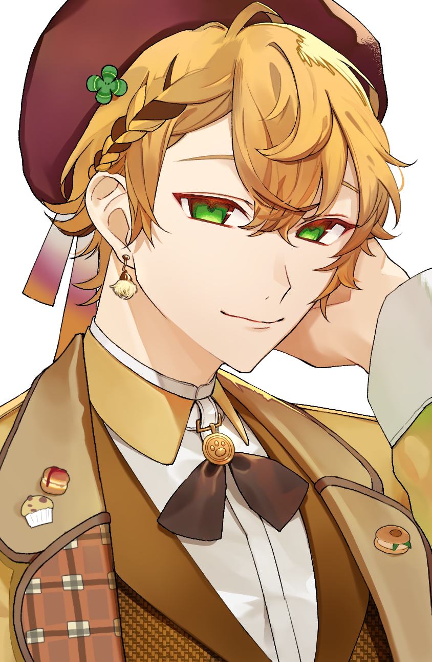 1boy beret blonde_hair braid brown_hair collared_shirt earrings formal_clothes fragaria_memories green_eyes hand_on_own_head hat highres jacket jewelry lapel_pin looking_at_viewer male_focus multicolored_hair noko_(meityoko73) puruth_(fragaria_memories) shirt short_hair smile solo streaked_hair suit upper_body