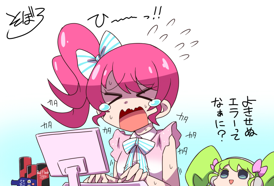 >_< 2girls blue_ribbon can closed_eyes commentary_request drink_can energy_drink flying_sweatdrops frown green_hair idol_land_pripara computer_keyboard korean_commentary long_hair mini_falulu monitor multiple_girls neck_ribbon open_mouth pink_hair pretty_series pripara ribbon shaded_face side_ponytail sidelocks smile soboro_(jitome_dan) soda_can sophia-chan sweat syn_sophia tears twintails typing upper_body
