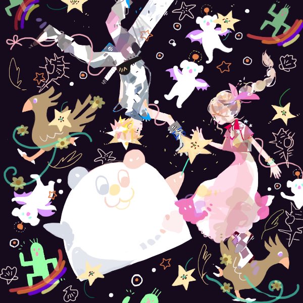 1boy 1girl aerith_gainsborough bangle black_background blonde_hair blue_shirt bracelet braid braided_ponytail brain_buster brown_hair buster_sword chocobo cloud_strife cropped_jacket dress final_fantasy final_fantasy_vii floating flower hair_ribbon jacket jewelry long_dress long_hair moogle pink_dress pink_ribbon red_jacket ribbon sabotender shirt short_hair single_braid spiked_hair yellow_flower