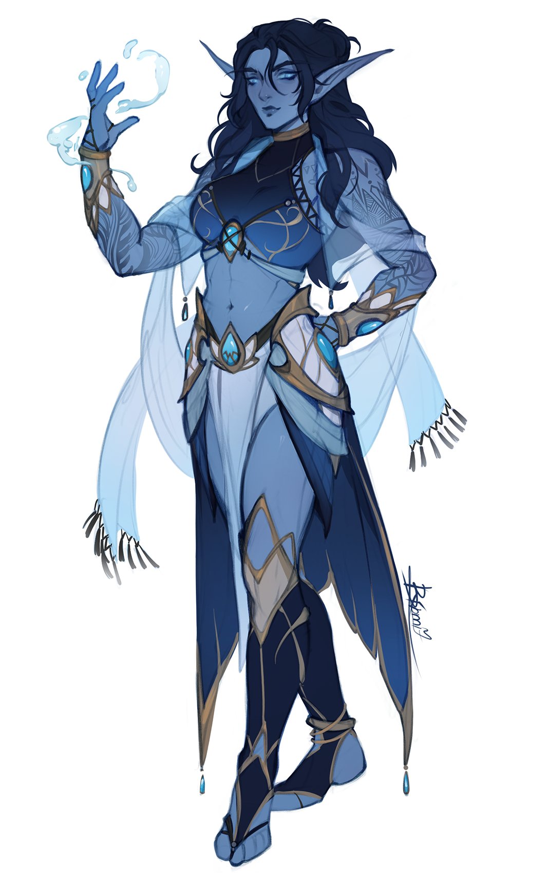 1girl birmit black_hair blue_eyes blue_gem blue_skin character_request colored_skin concept_art copyright_request elf full_body gem hand_on_own_hip hand_up highres long_hair long_pointy_ears looking_at_viewer magic muscular muscular_female navel night_elf_(warcraft) original pointy_ears simple_background solo stomach tattoo toeless_legwear warcraft water white_background world_of_warcraft