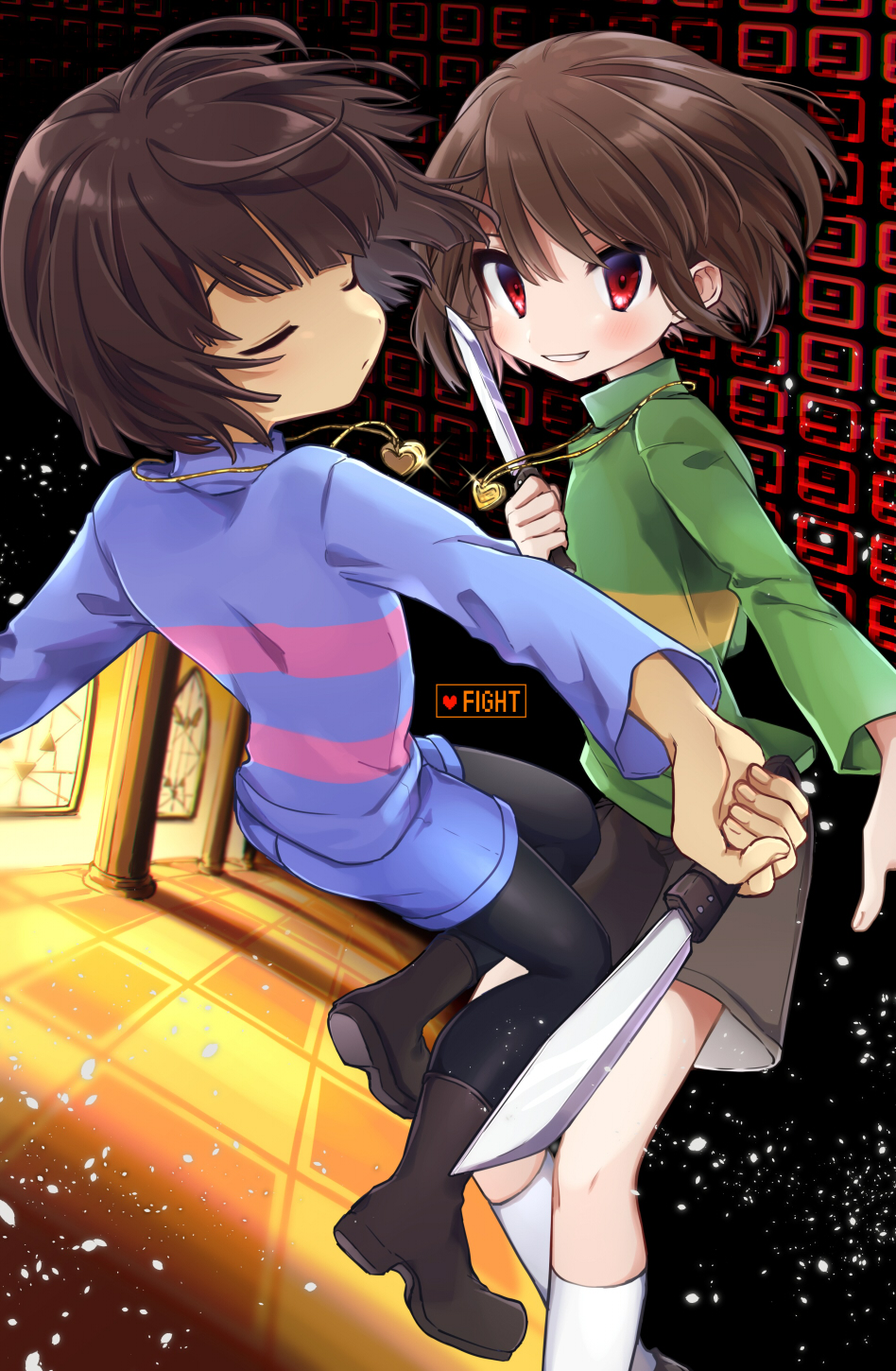 2others ahoge black_pantyhose blue_shorts blue_sweater blunt_bangs blush boots brown_footwear brown_hair brown_shorts chara_(undertale) checkered_floor closed_mouth denim denim_shorts english_text feet_out_of_frame fingernails frisk_(undertale) from_behind green_sweater grin hallway heart heart_necklace highres holding holding_knife jewelry kneehighs knife leftporygon multiple_others necklace outstretched_arm outstretched_arms pantyhose pillar pink_sweater short_hair shorts smile socks striped_clothes striped_sweater sweater turtleneck turtleneck_sweater undertale utdr_(toby_fox) white_socks window yellow_sweater