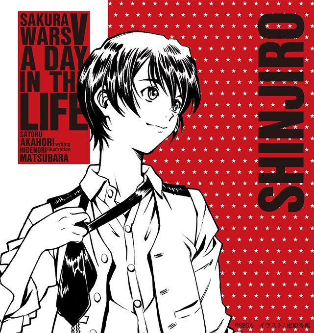 1boy artist_name bad_link black_hair button_gap buttons chain character_name collared_shirt copyright_name copyright_notice dress_shirt looking_up matsubara_hidenori neck necktie official_art open_clothes open_vest parted_lips pocket roman_numeral sakura_taisen sakura_taisen_v second-party_source sega shirt short_hair three-quarter_sleeves sleeves_rolled_up solo square star_(symbol) star_symbol_background taiga_shinjirou two-tone_background undone_necktie vest