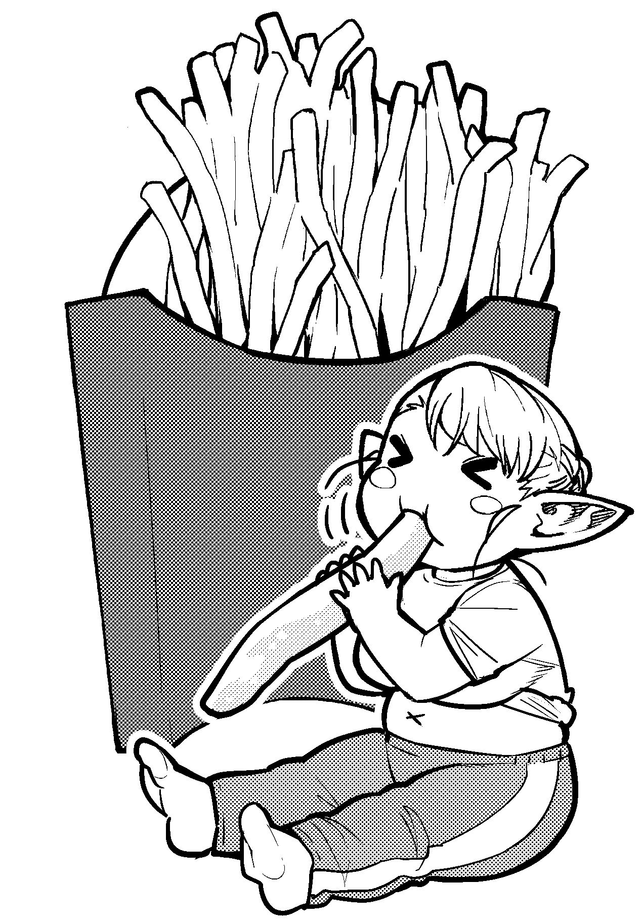>_< 1girl belly blush_stickers braid breasts chibi clothes_lift crown_braid eating elf elf-san_wa_yaserarenai. elfuda_(elf-san_wa_yaserarenai.) food french_fries greyscale highres large_breasts monochrome navel plump pointy_ears shirt_lift sitting socks solo synecdoche