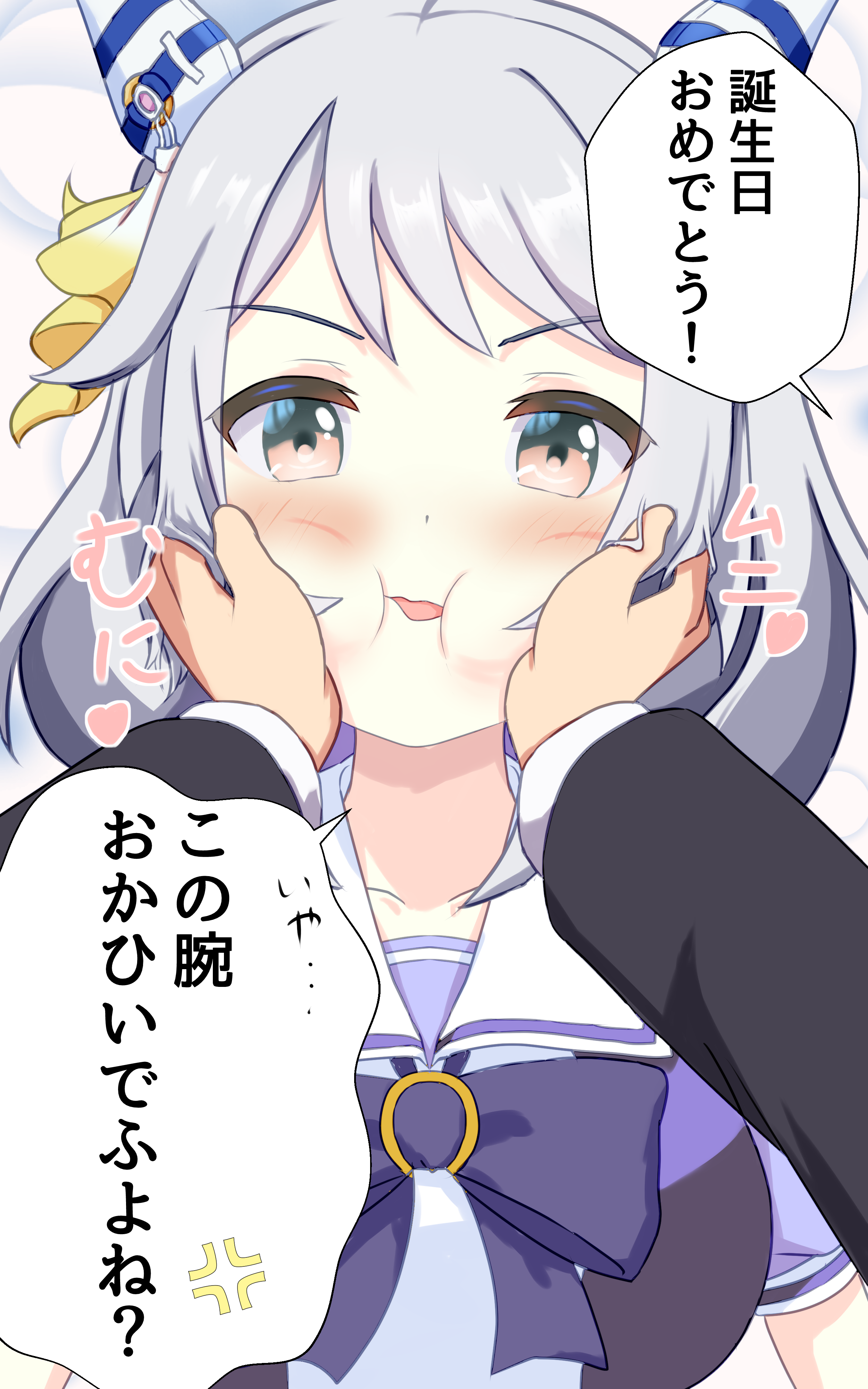 1girl absurdres animal_ears blush breasts brown_eyes collarbone commentary_request grey_hair hair_ornament hands_on_another's_cheeks hands_on_another's_face highres hishi_miracle_(umamusume) horse_ears horse_girl looking_at_viewer medium_breasts medium_hair nagonago10 open_mouth pov pov_hands school_uniform simple_background solo_focus squishing tracen_school_uniform translation_request umamusume white_background