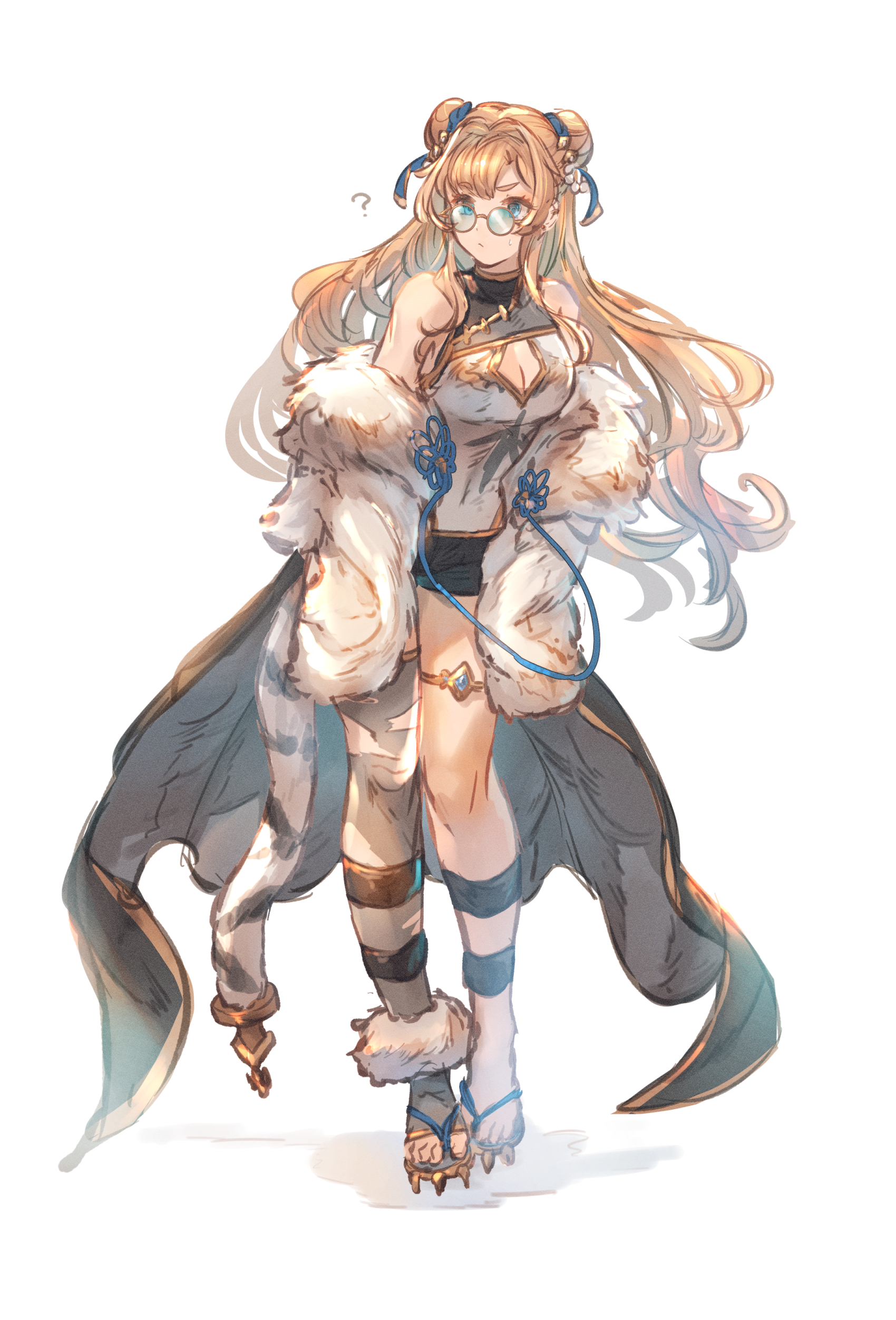 1girl ? absurdres asymmetrical_legwear black_shorts blonde_hair blue_eyes cleavage_cutout clothing_cutout commentary_request double_bun fur-trimmed_jacket fur_trim glasses granblue_fantasy hair_bun hair_intakes hibana_(hibana_ztlv) highres jacket long_hair off-shoulder_jacket off_shoulder sandals shorts sidelocks spoken_question_mark white_tiger_print zeta_(granblue_fantasy)