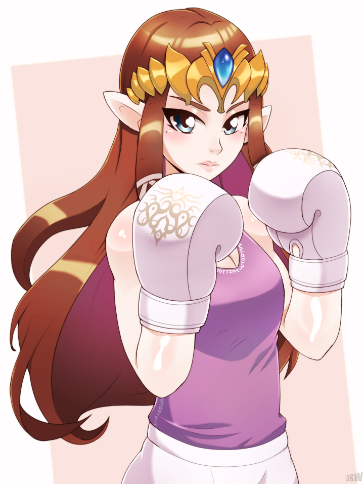 blue_eyes boxing boxing_gloves brown_hair closed_mouth commentary commission demon_wolf elf english_commentary expressionless facing_viewer forehead_jewel gloves hylian_(language) jewelry nintendo pointy_ears princess_zelda purple_shirt shirt simple_background solo the_legend_of_zelda the_legend_of_zelda:_twilight_princess tiara triforce triforce_print two-tone_background white_gloves