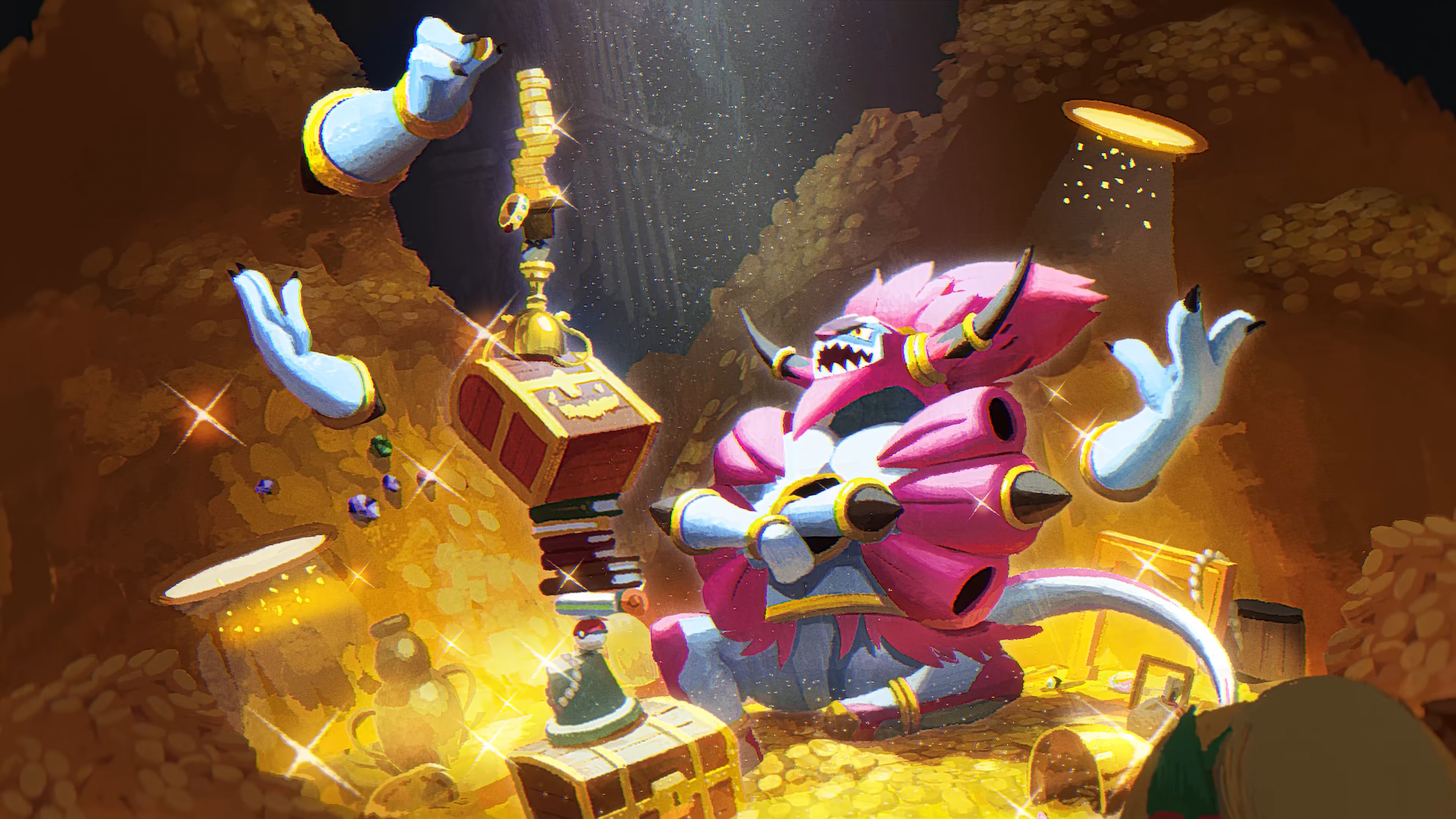 1boy absurdres claws crossed_arms extra_arms fangs full_body gen_6_pokemon gold highres hoopa hoopa_(unbound) horns legendary_pokemon money mythical_pokemon nintendo official_art open_mouth poke_ball poke_ball_(basic) pokemon pokemon_(creature) sharp_teeth sitting smile teeth