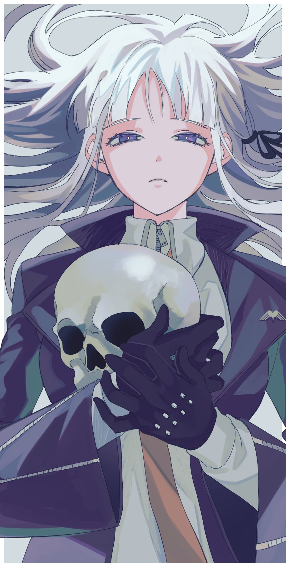 1girl bad_id bad_twitter_id bird_pin black_gloves black_ribbon bong_(0u0bon) border collared_jacket collared_shirt danganronpa:_trigger_happy_havoc danganronpa_(series) expressionless eyelashes father_and_child father_and_daughter gloves grey_background hair_ribbon hair_spread_out half-closed_eyes high_collar highres holding holding_skull jacket kirigiri_jin kirigiri_kyoko layered_sleeves long_hair long_sleeves lying necktie on_back open_clothes open_jacket orange_necktie parent_and_child parted_lips purple_eyes purple_jacket purple_sleeves ribbon shirt simple_background skull solo spoilers straight-on studded_gloves upper_body white_border white_hair white_shirt zipper zipper_pull_tab