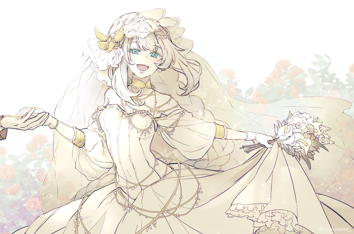 1girl bare_shoulders blue_eyes bouquet breasts dress fate/grand_order fate_(series) flower gloves holding holding_bouquet marie_antoinette_(fate) medium_breasts open_mouth shuiqin smile solo strapless strapless_dress veil white_dress white_flower white_gloves white_hair