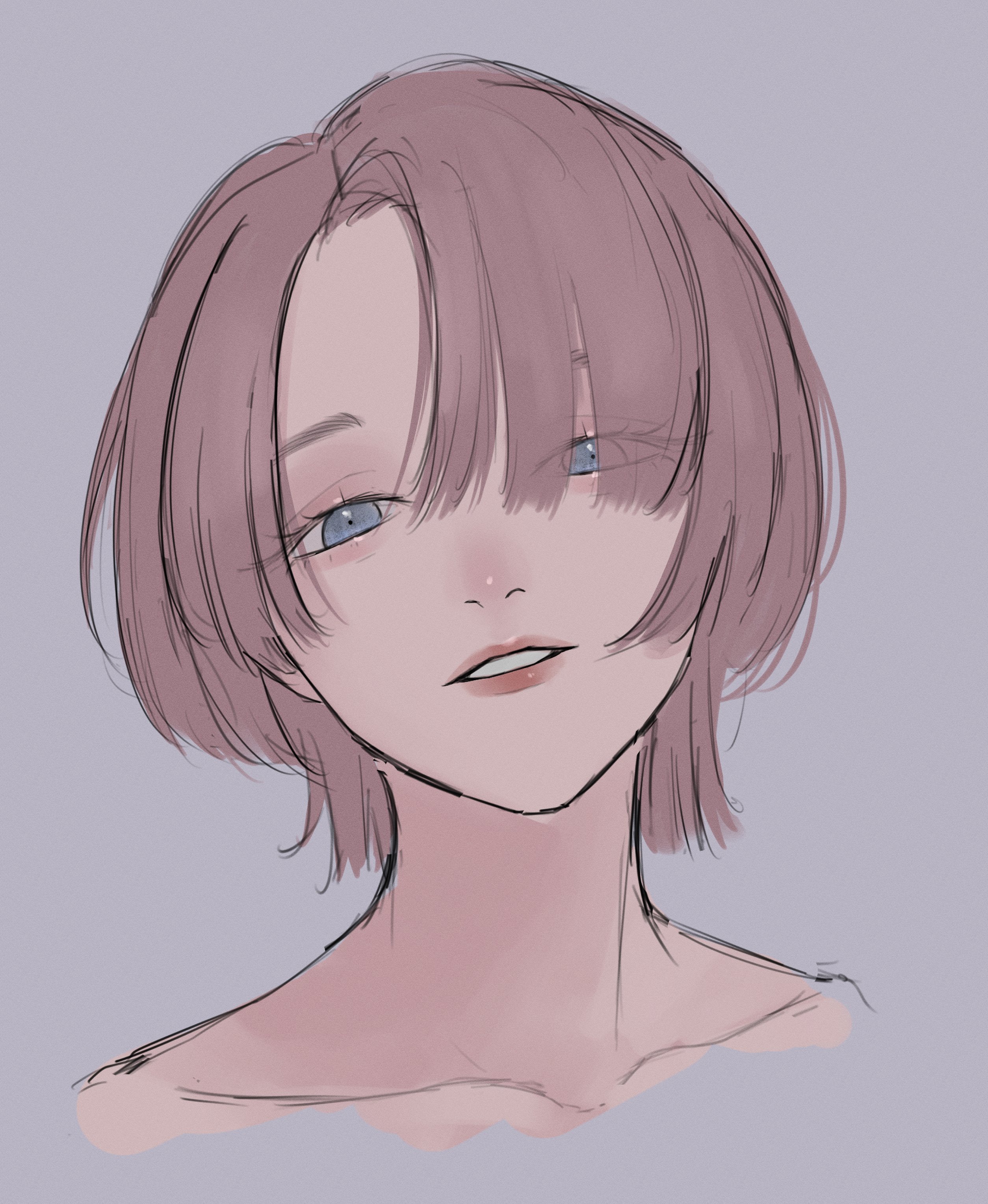 1girl absurdres arimura_mao blue_eyes collarbone curtained_hair gakuen_idolmaster grey_background hair_over_one_eye highres idolmaster inase_(1na1000) light_brown_hair light_smile looking_at_viewer parted_lips portrait red_lips short_hair sidelocks simple_background sketch smile solo