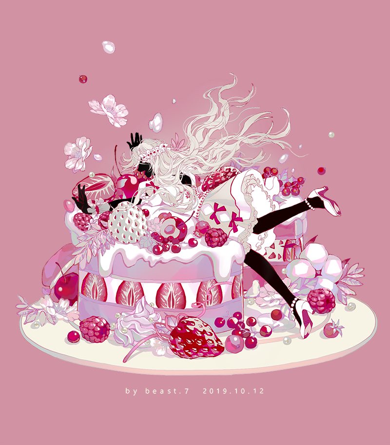 1girl anklet artist_name back_cutout bare_back bead_anklet beads berry black_skirt blonde_hair bow skirt_bow cake cherry cherry_blossoms chinese_commentary clothing_cutout commentary_request dated falling flower food frilled_skirt frills fruit full_body hairband heart heart_print high_heels long_hair medium_skirt original outstretched_arms oversized_food oversized_object pink_background pink_bow pink_flower pink_skirt pink_theme plate puffy_short_sleeves puffy_sleeves ribbon-trimmed_hairband shirt short_sleeves simple_background skirt sleeve_bow solo strawberry strawberry_slice very_long_hair wavy_hair white_footwear white_hairband white_shirt white_sleeves wu_shoushou