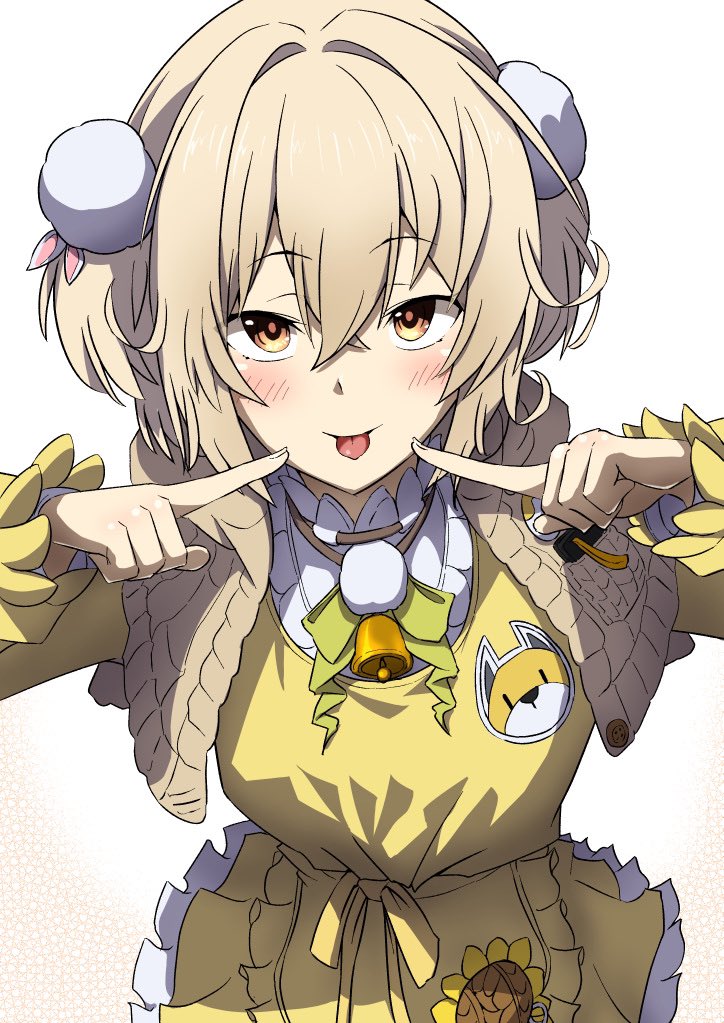 1girl :p blonde_hair blush breasts brown_capelet capelet dress frills goddess_of_victory:_nikke hair_ornament hood hooded_capelet liter_(cute_sunflower)_(nikke) liter_(nikke) long_sleeves looking_at_viewer medium_breasts official_alternate_costume pom_pom_(clothes) pom_pom_hair_ornament sankakukin_gear short_hair solo tongue tongue_out yellow_dress yellow_eyes