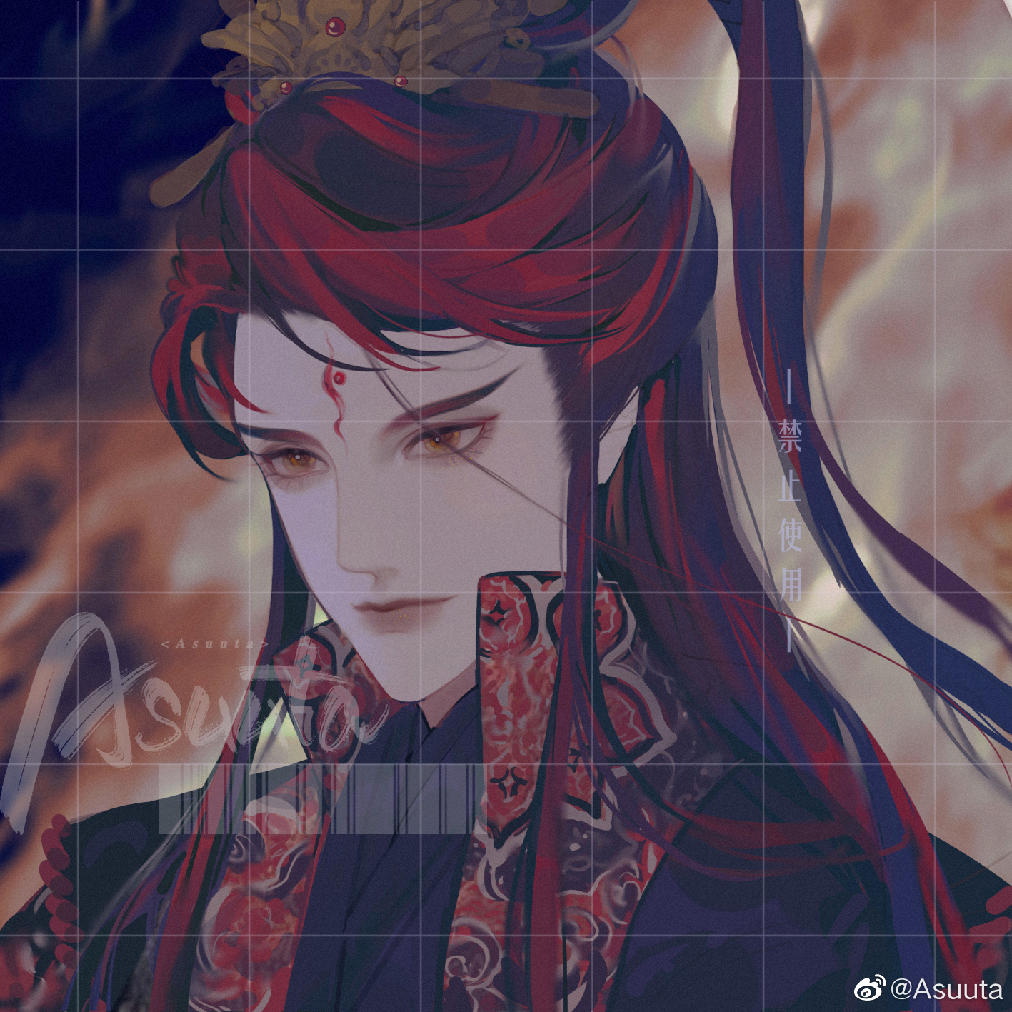 1boy artist_name asuuta barcode black_robe chinese_clothes chinese_commentary closed_mouth collared_vest commentary_request crown expressionless eyelashes facial_mark fiery_background fire floral_print forehead_mark gold_crown hanfu high_collar high_ponytail highres long_hair looking_ahead male_focus open_clothes open_vest original ponytail red_eyes red_hair red_lips red_vest robe sample_watermark solo thick_eyebrows upper_body vest watermark weibo_watermark
