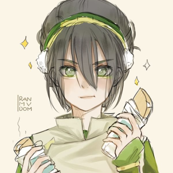 1girl avatar:_the_last_airbender avatar_legends black_hair closed_mouth food green_eyes hair_between_eyes holding holding_food looking_at_viewer non-web_source ranmvdom simple_background solo source_request sparkle tagme toph_beifong upper_body