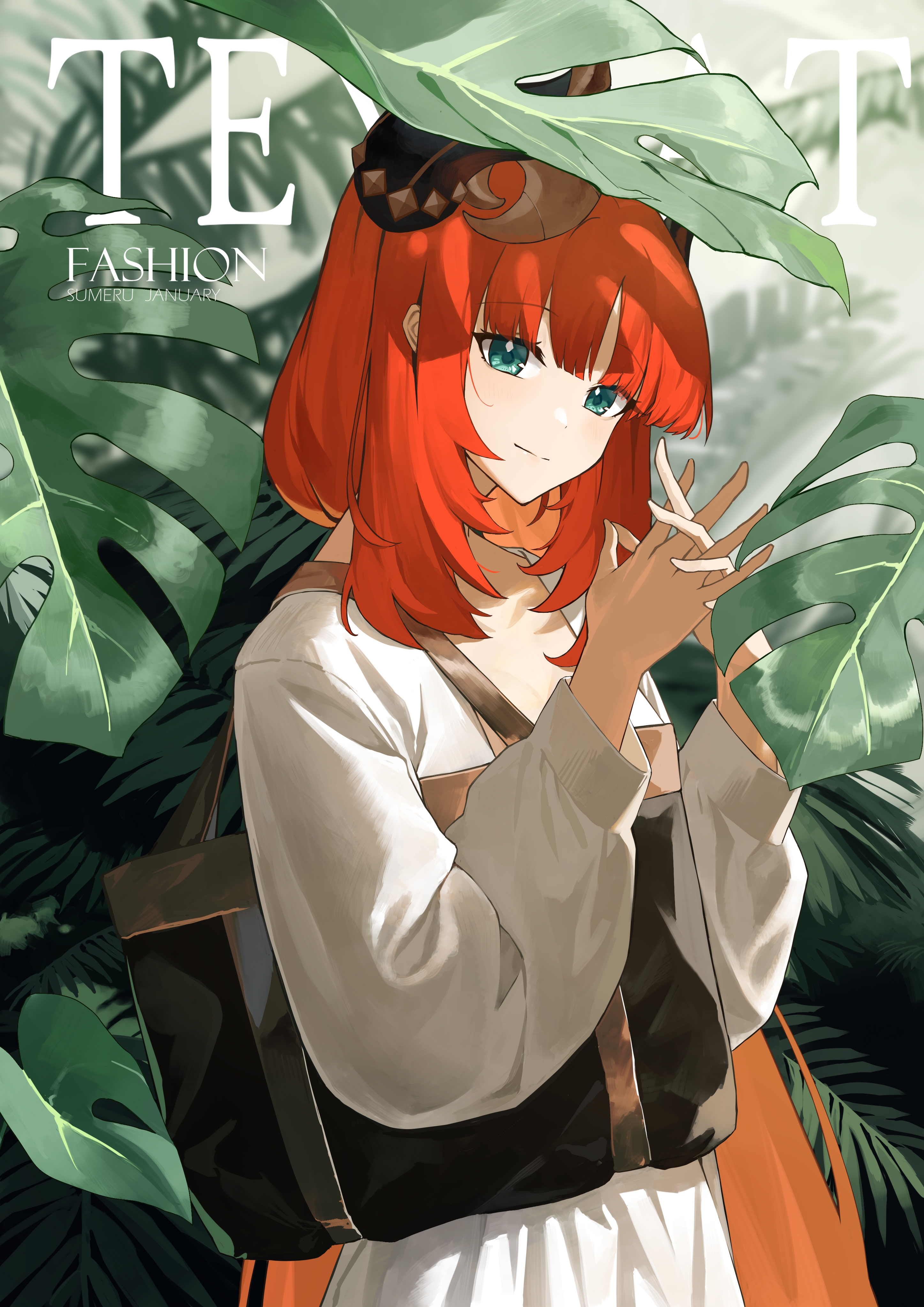 1girl absurdres alternate_costume baiyinzhideng black_bag closed_mouth commentary_request cowboy_shot dress english_text fern genshin_impact green_eyes hands_up highres interlocked_fingers long_hair long_sleeves looking_at_viewer nilou_(genshin_impact) orange_hair own_hands_together plant solo white_dress
