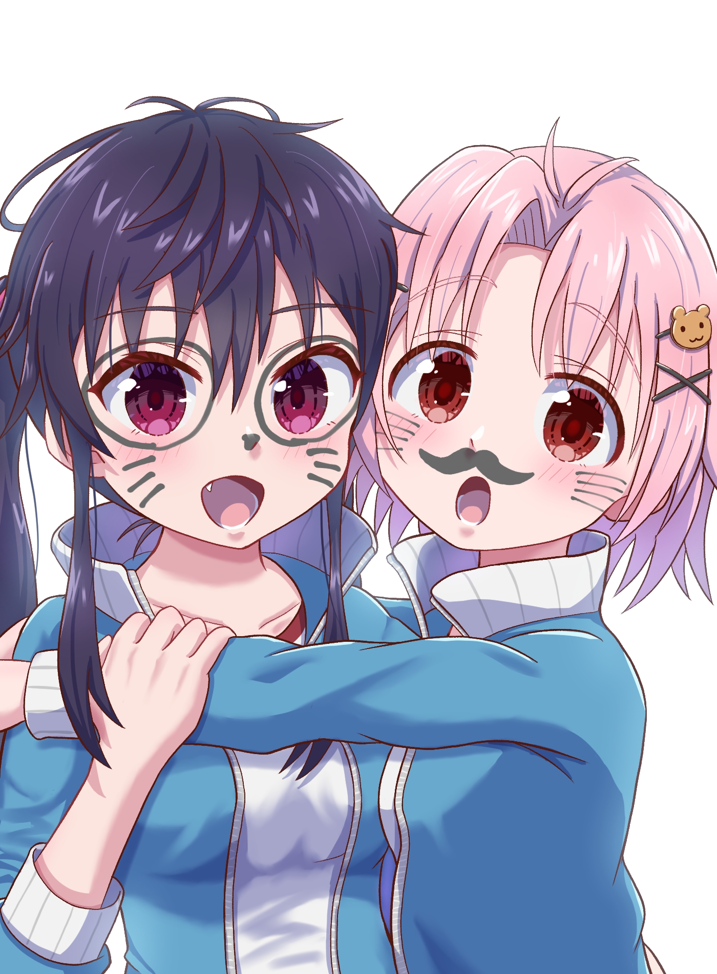 2girls ahoge animal_hair_ornament blue_jacket blush ebisuzawa_kurumi facepaint fang gakkou_gurashi! gym_uniform hair_ornament hand_on_another's_wrist highres hug jacket long_hair looking_at_viewer medium_hair multiple_girls open_clothes open_jacket open_mouth pink_eyes pink_hair purple_eyes purple_hair shirt simple_background takeya_yuki twintails user_pcsh3757 white_background white_shirt x_hair_ornament