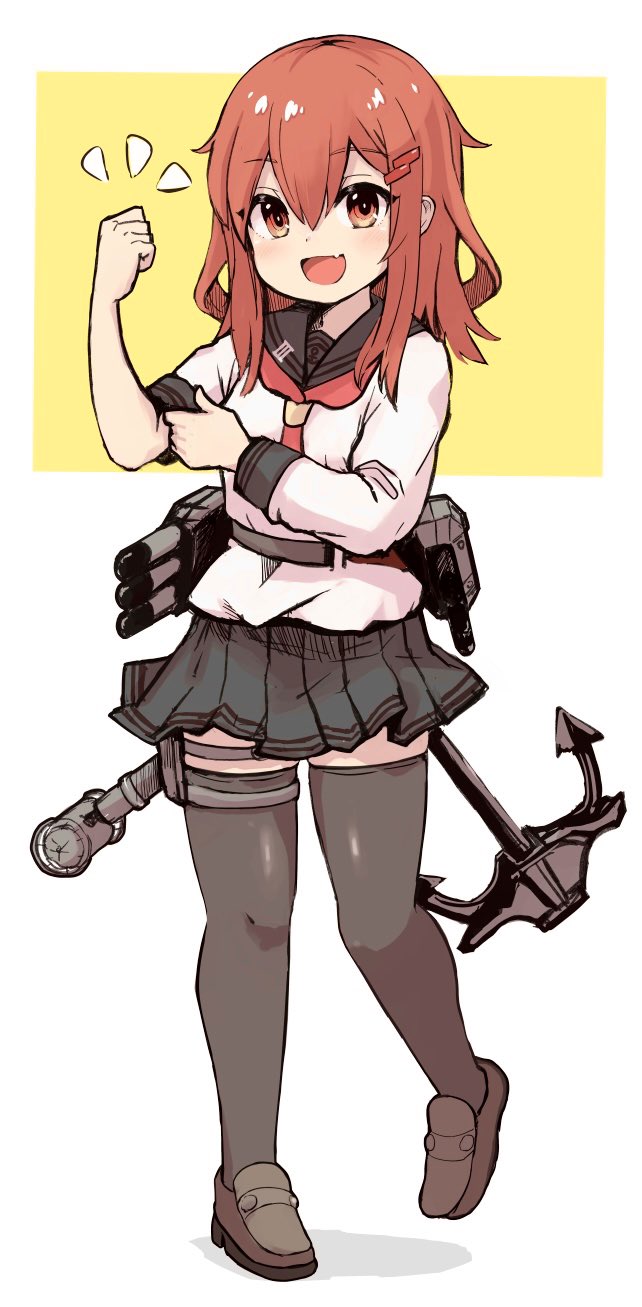 1girl anchor anchor_symbol black_skirt black_thighhighs blush brown_eyes brown_hair clenched_hand commentary fang full_body hair_between_eyes hair_ornament hairclip highres ikazuchi_(kancolle) kantai_collection loafers long_sleeves medium_hair neckerchief open_mouth original_remodel_(kantai_collection) pleated_skirt red_neckerchief rigging sailor_collar school_uniform serafuku shoes simple_background skirt sleeve_rolled_up smile solo standing thigh_strap thighhighs two-tone_background unagiman