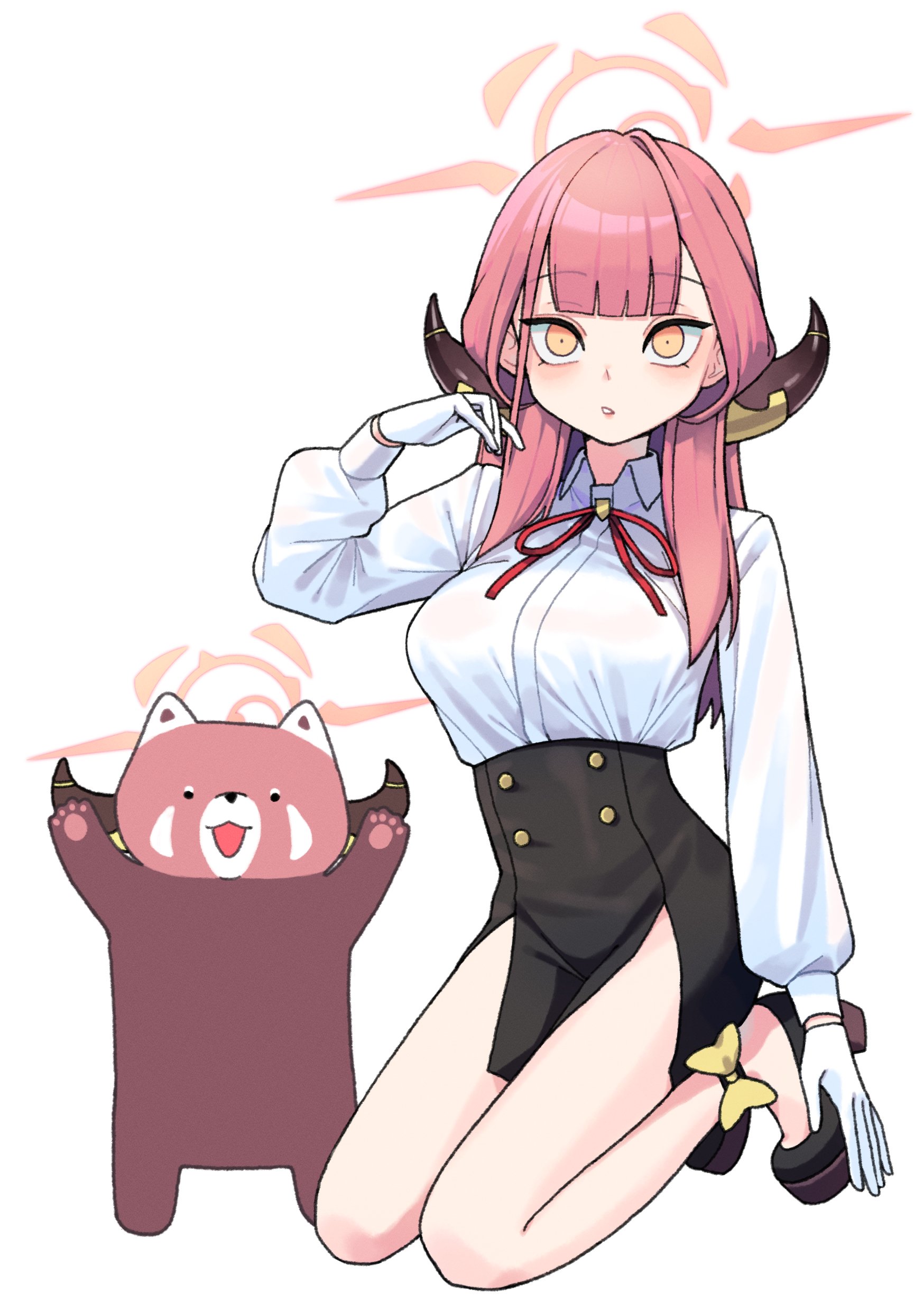 1girl 28_(282teeth) absurdres animalization aru_(blue_archive) black_footwear black_skirt blue_archive blunt_bangs bow bowtie collared_shirt commentary_request demon_girl demon_horns dual_persona gloves halo high-waist_skirt high_heels highres horns long_hair long_sleeves looking_at_viewer parted_lips pencil_skirt raccoon red_bow red_bowtie red_hair school_uniform seiza shirt side_slit sidelocks simple_background sitting skirt white_background white_gloves white_shirt yellow_eyes